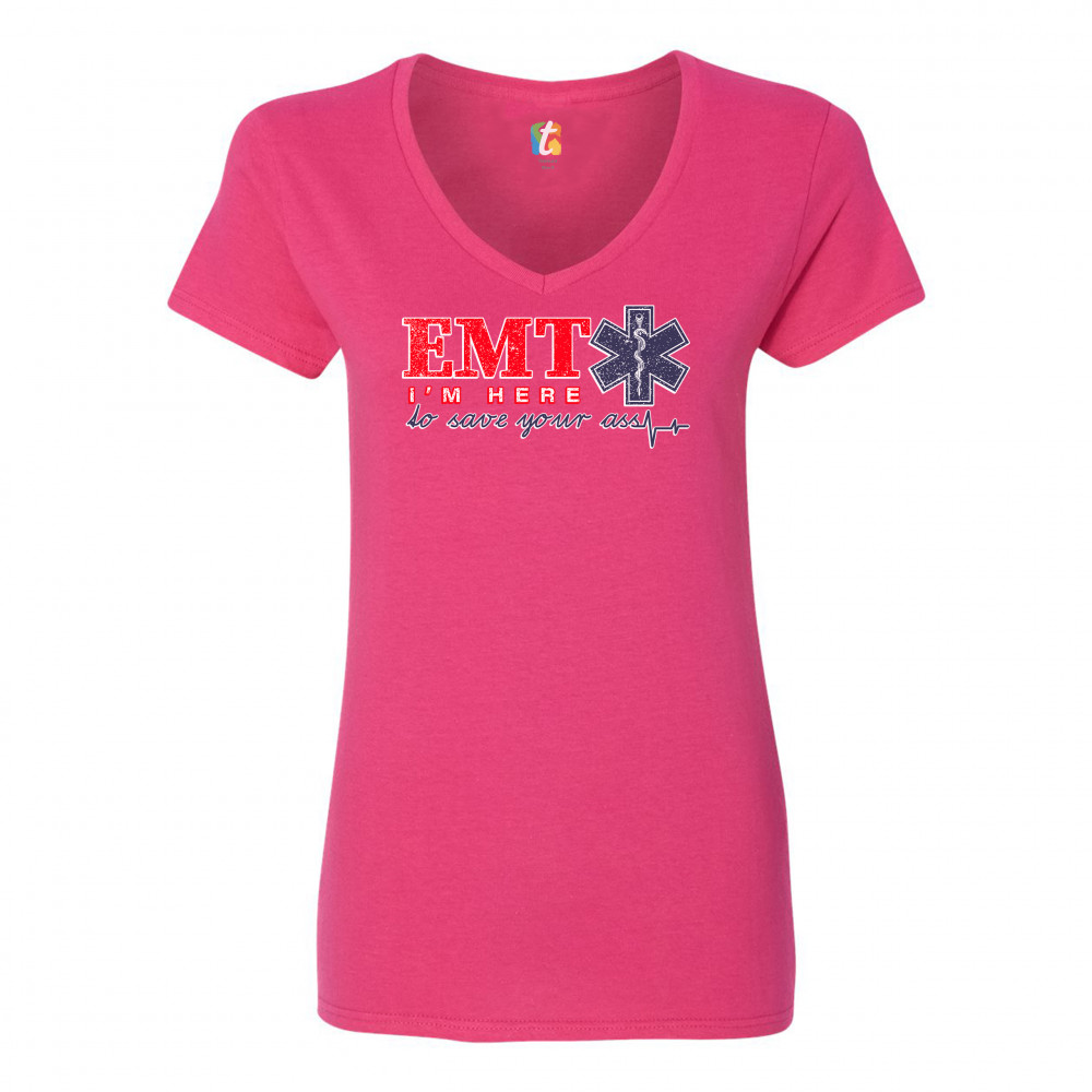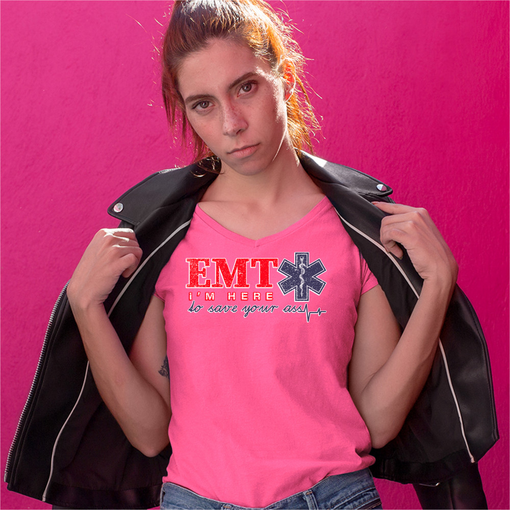 A funny print saying "EMT I'm Here to Save Your Ass". To the right of "EMT" there is the Star of Life, the worldwide recognized symbol of emergency medical services, with the Rod of Asclepius inside of it. A great choice as a gift for a first responder.