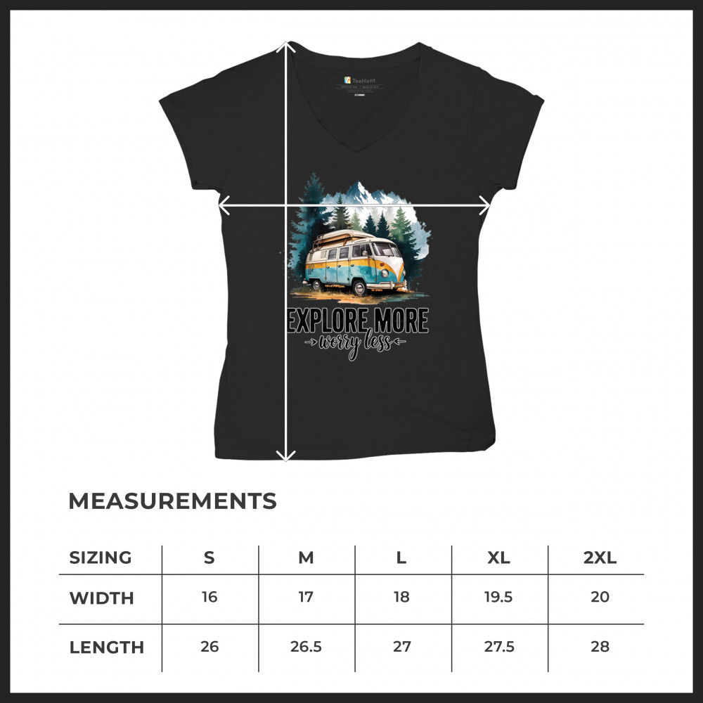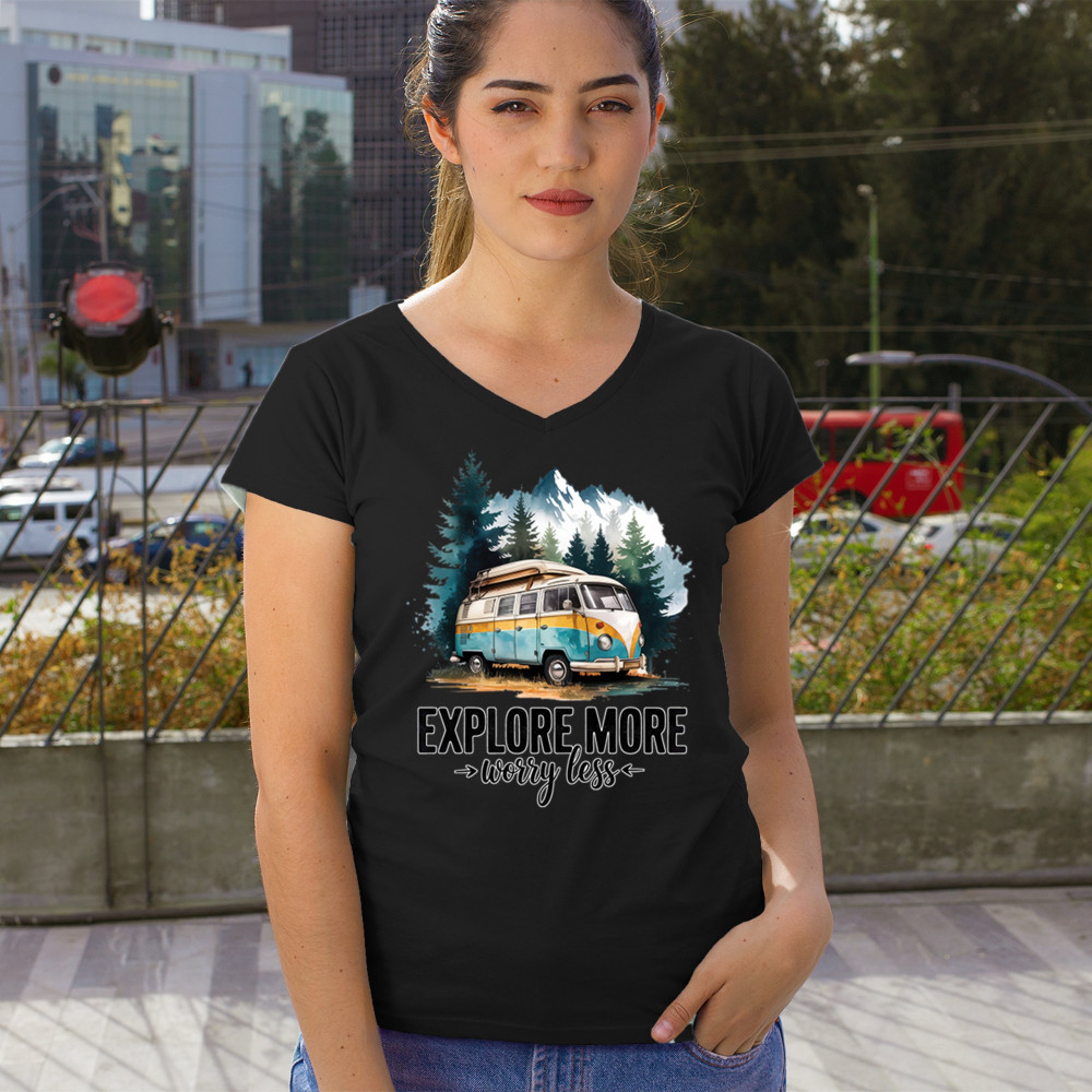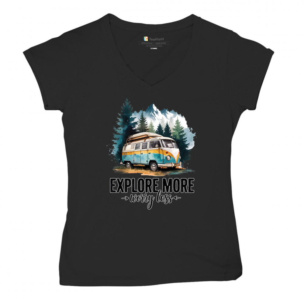 EXPLORE MORE WORRY LESS women's v-neck t-shirt camping trail hiking tent life black