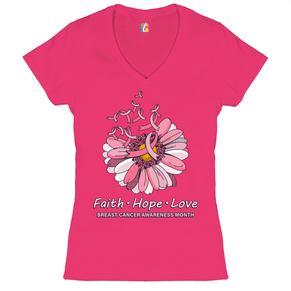 A print featuring a big flower with several petals missing and numerous pink ribbons flying away from it. The print says: "Faith Hope Love" and "Breast Cancer Awareness Month". Wear it to spread awareness abouth the disease and support a person you know w