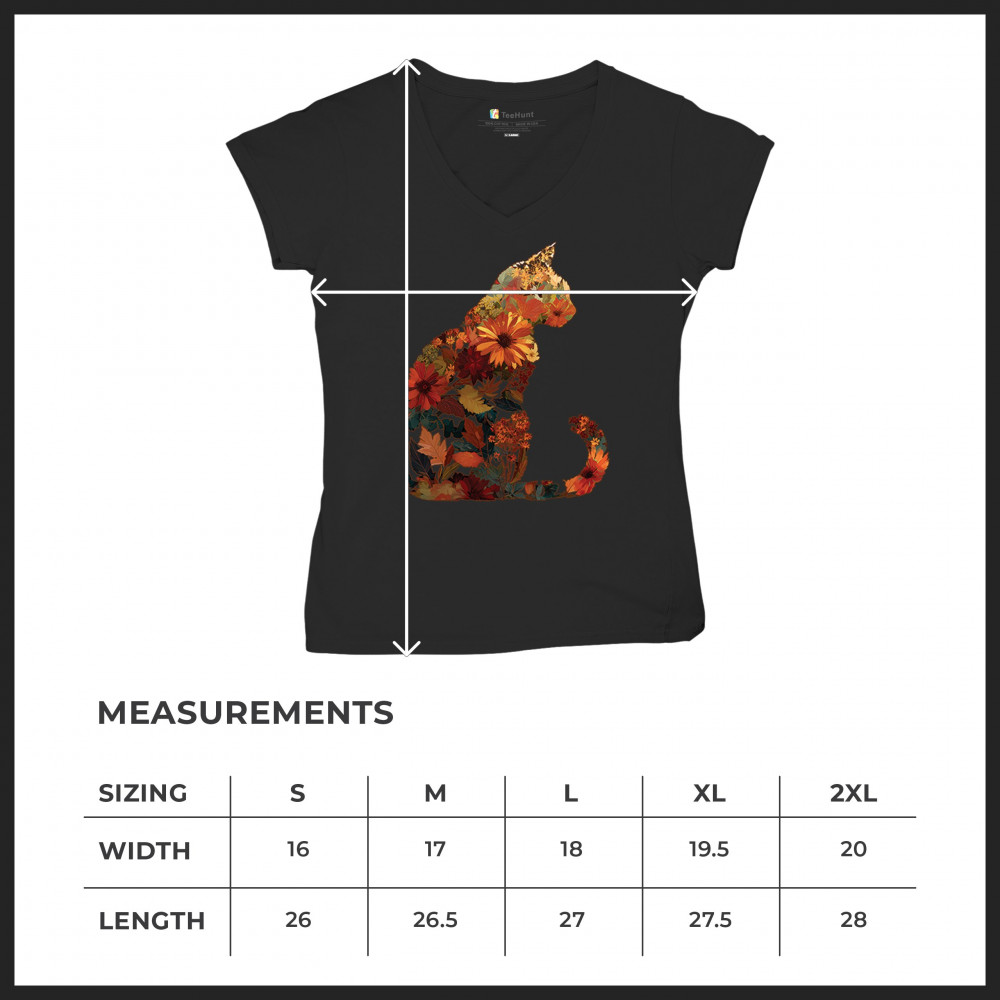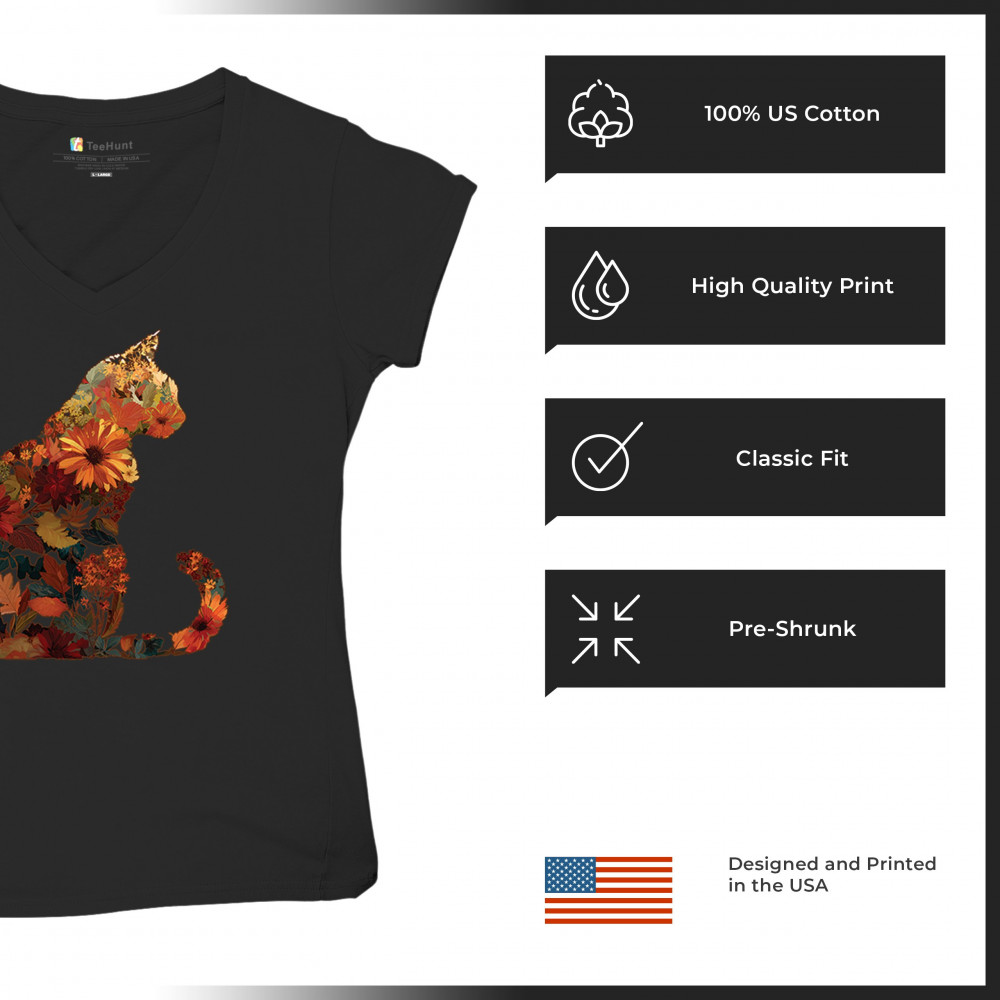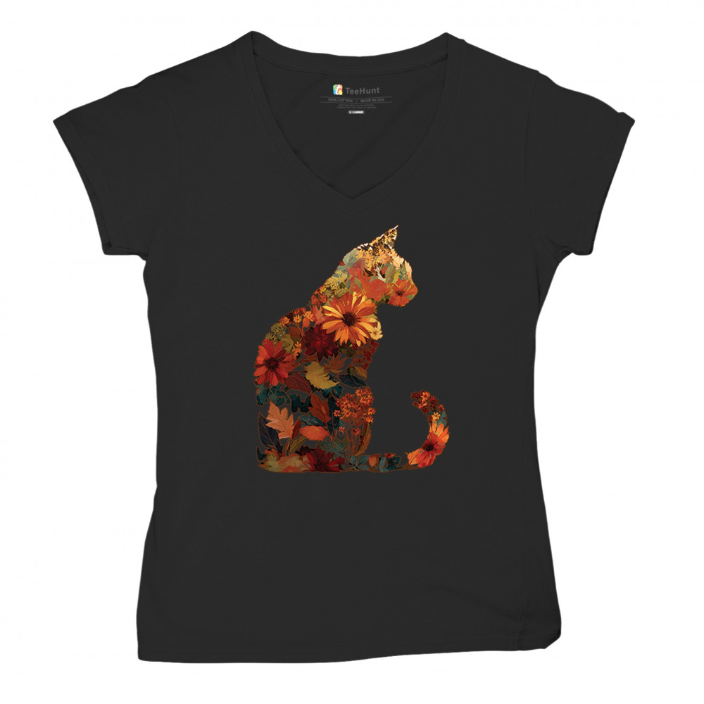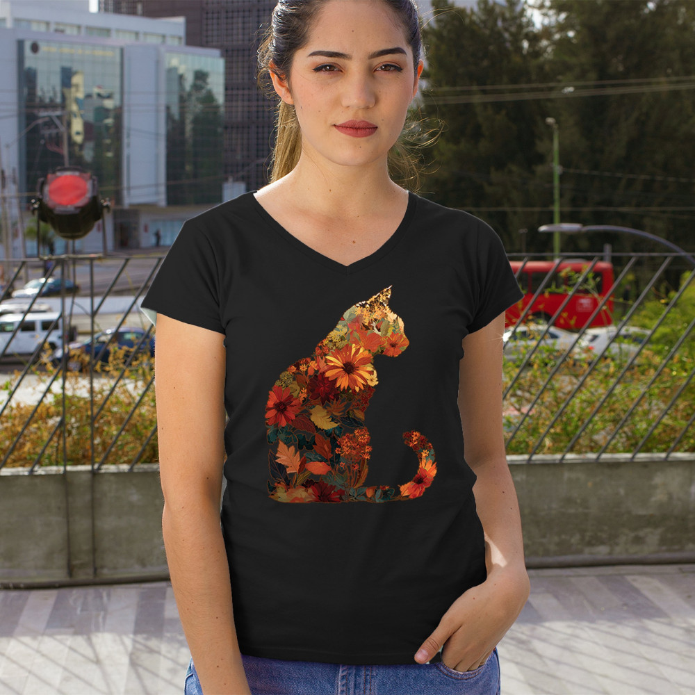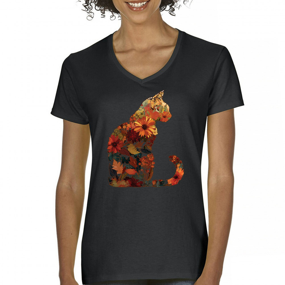 FALL CAT women's v-neck t-shirt floral leaves pumpkin patch harvest pet lover black