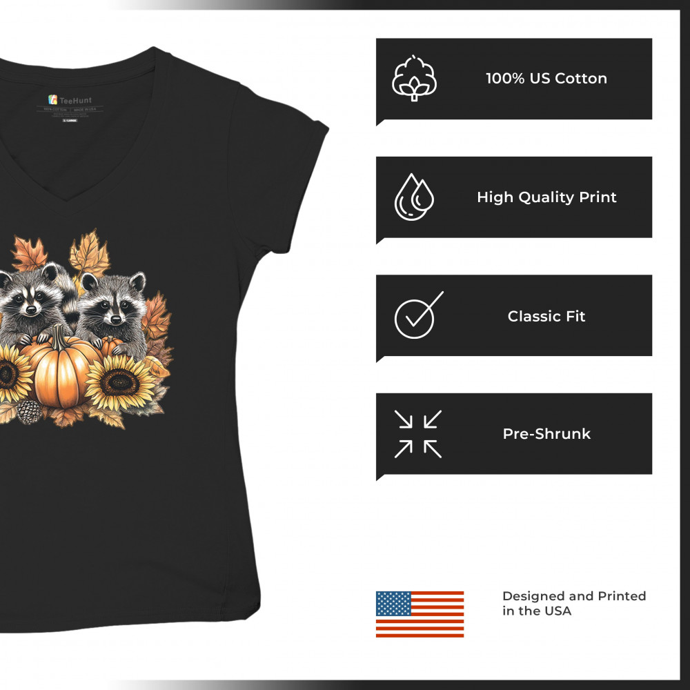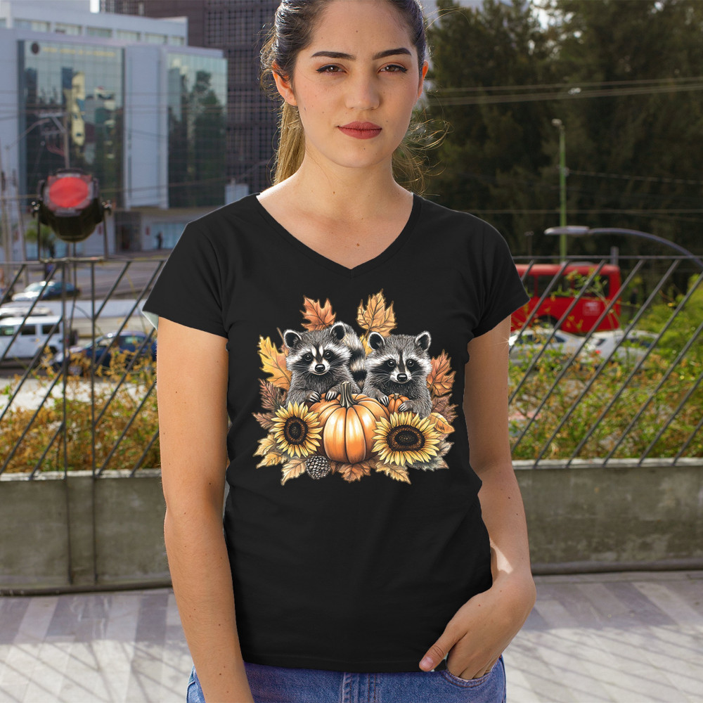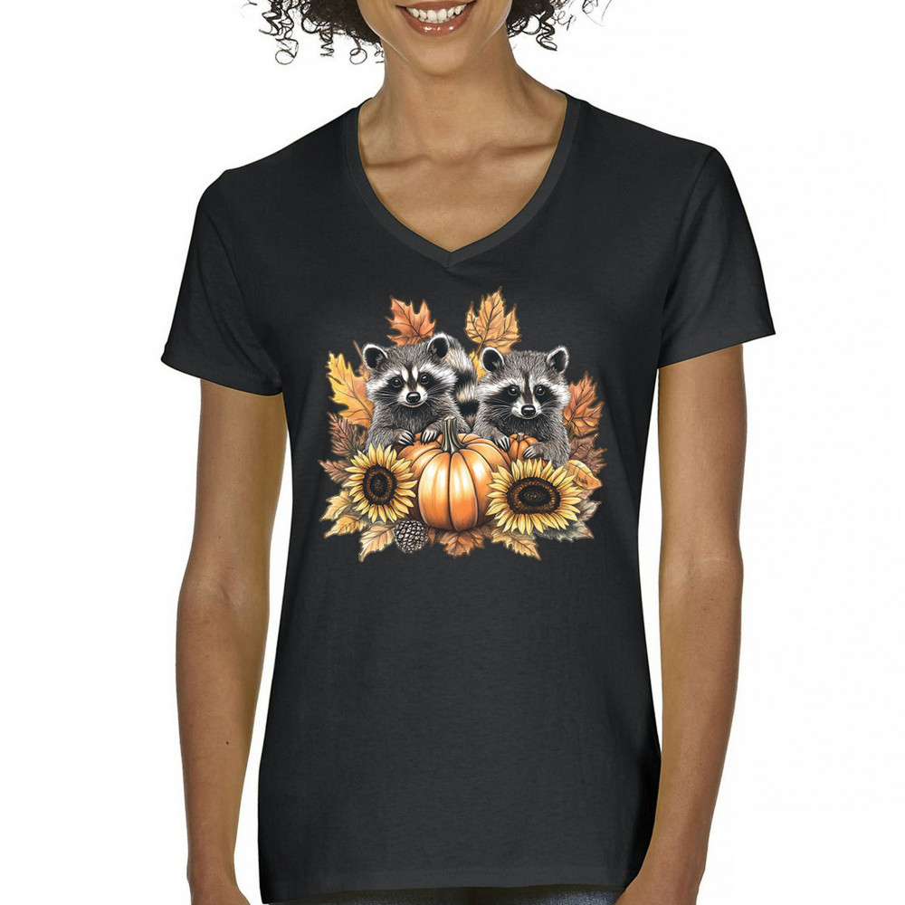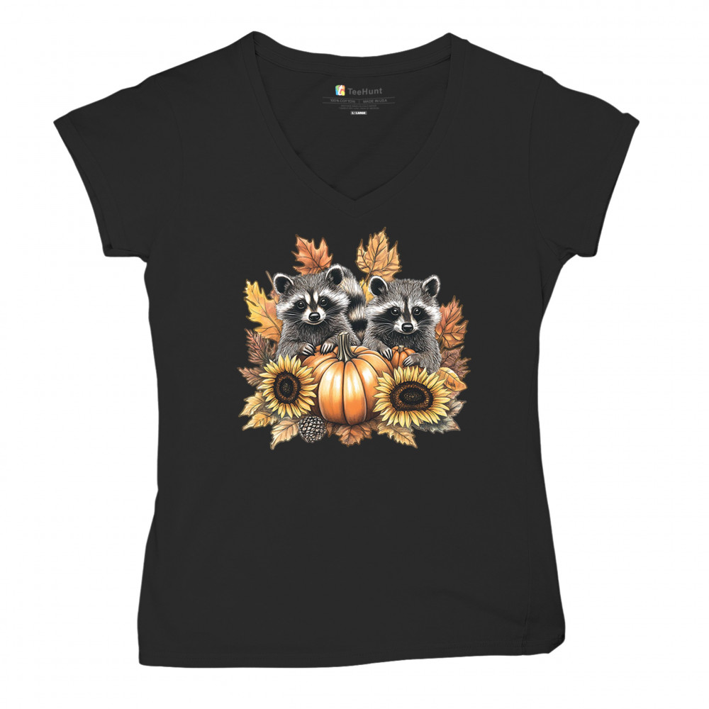 FALL RACCOONS women's v-neck t-shirt thanksgiving day sunflower pumpkin patch black
