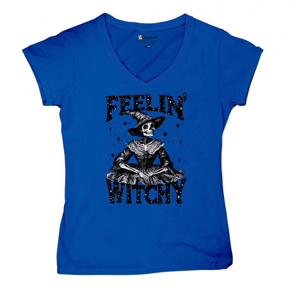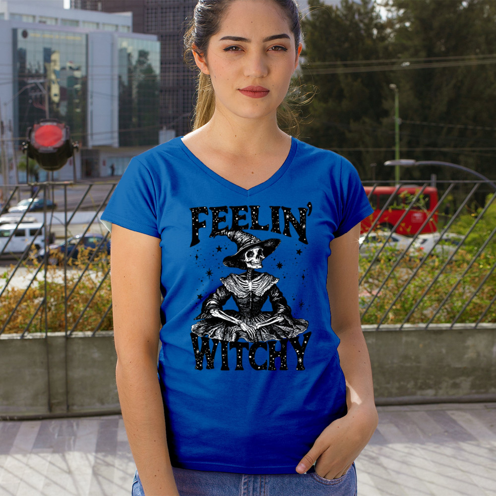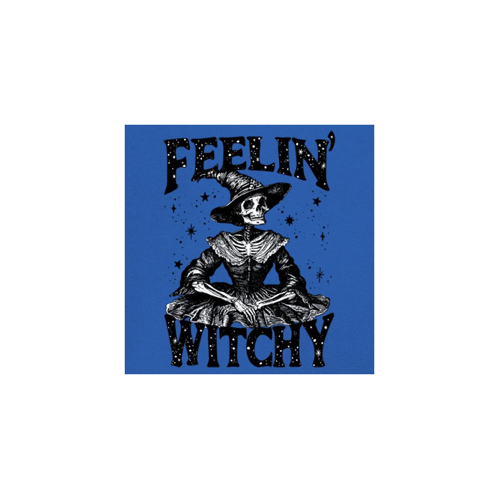 Add a touch of enchantment to your wardrobe with this "Feelin' Witchy" design. Perfect for Halloween, themed parties, or everyday wear, this piece captures gothic aesthetics with playful charm. Featuring a skeleton dressed as a witch, it celebrates the lighter side of spooky fashion. Ideal for those who enjoy blending whimsy with the supernatural, it's a must-have for the season.