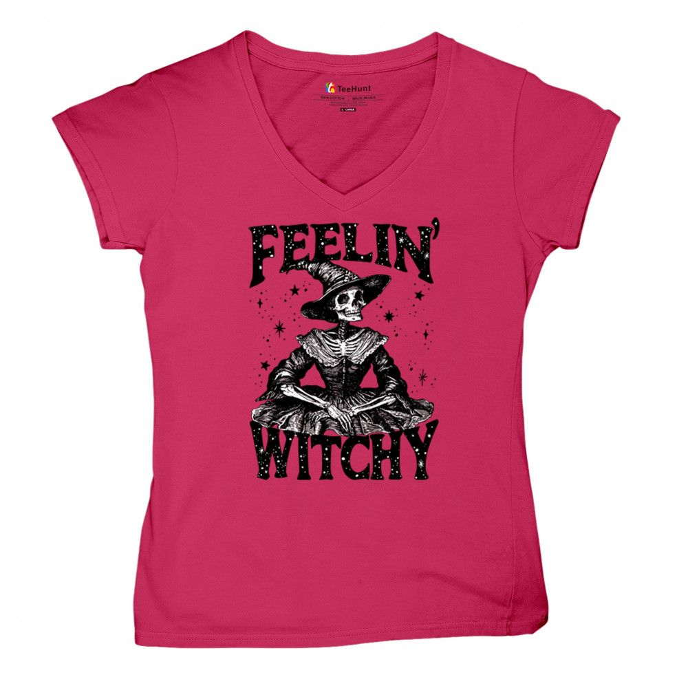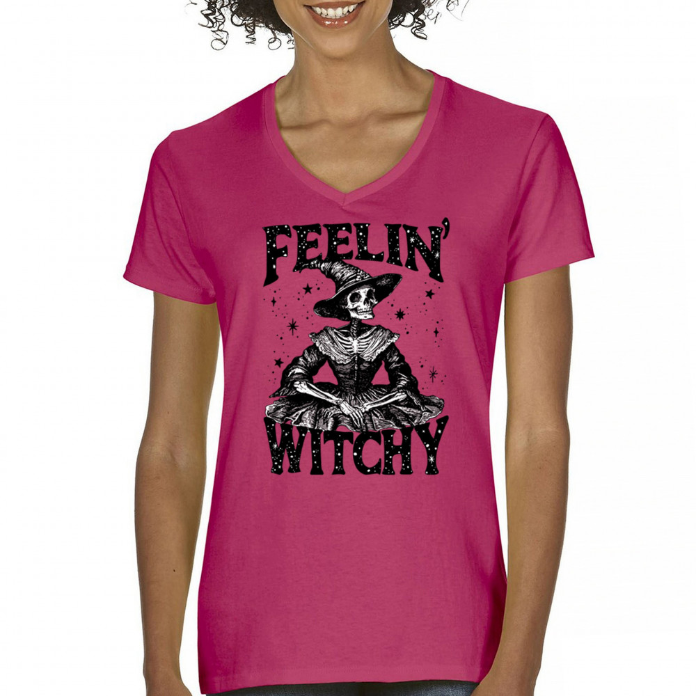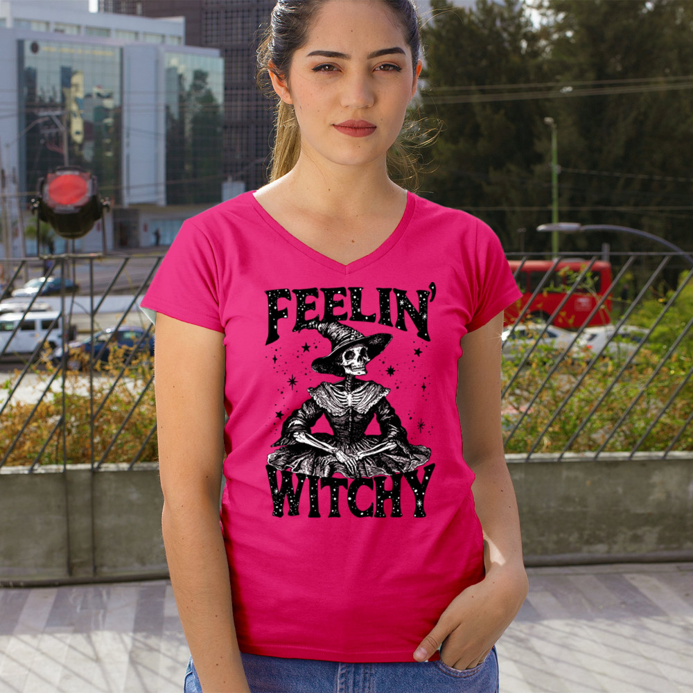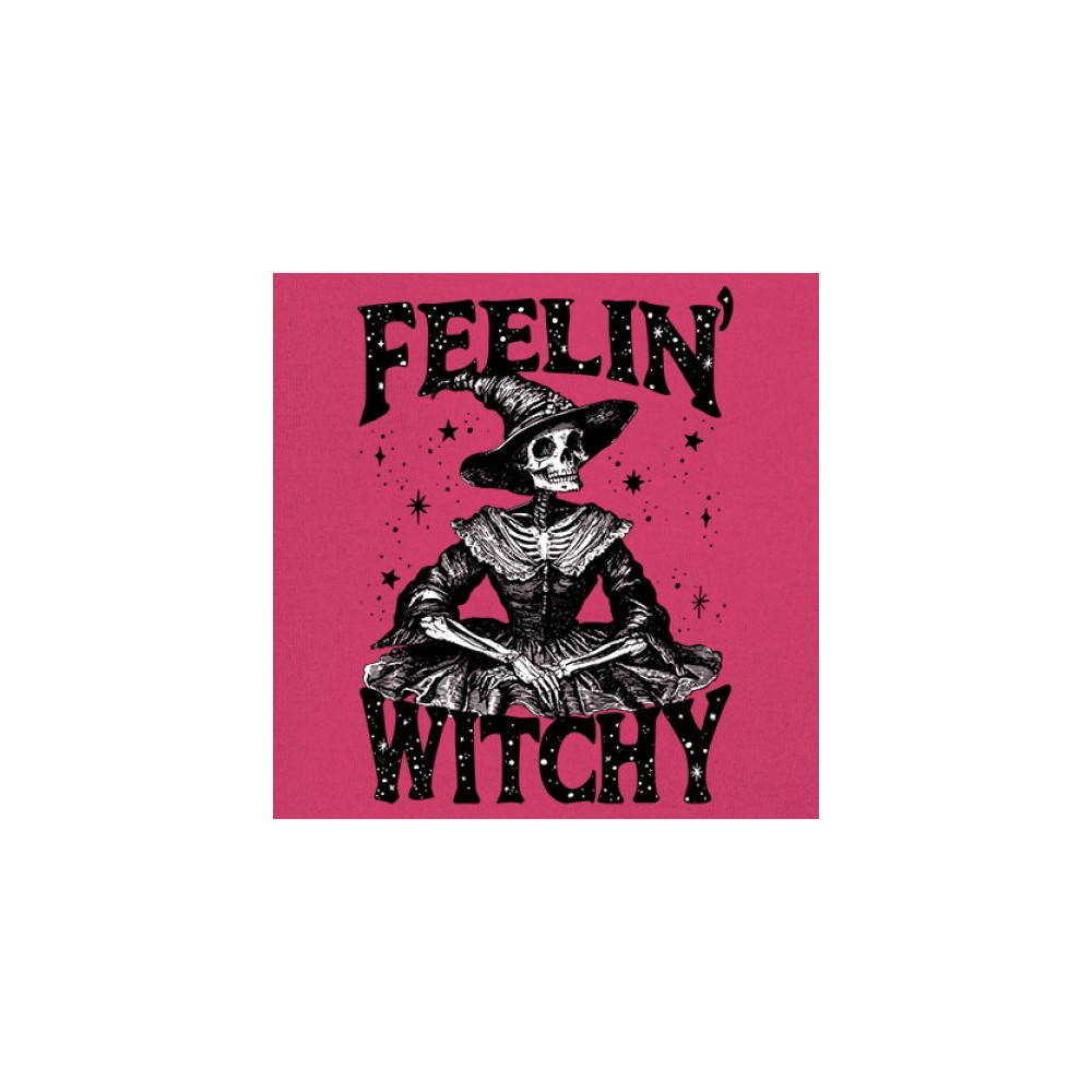 Add a touch of enchantment to your wardrobe with this "Feelin' Witchy" design. Perfect for Halloween, themed parties, or everyday wear, this piece captures gothic aesthetics with playful charm. Featuring a skeleton dressed as a witch, it celebrates the lighter side of spooky fashion. Ideal for those who enjoy blending whimsy with the supernatural, it's a must-have for the season.