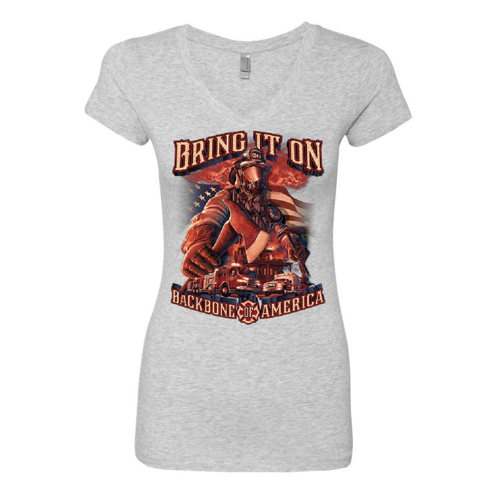 FIREFIGHTER BACKBONE OF AMERICA women's v-neck t-shirt fd fire and rescue hero gray