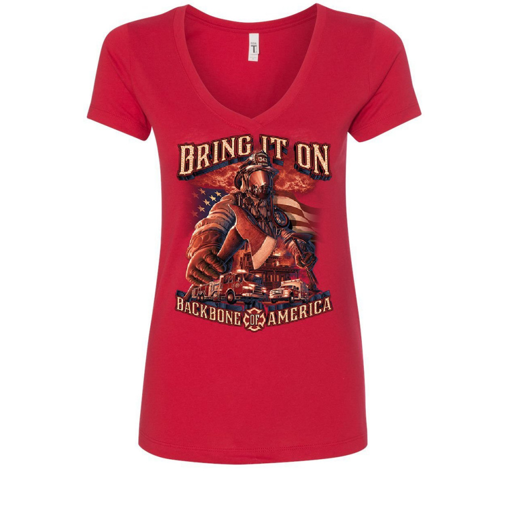 FIREFIGHTER BACKBONE OF AMERICA women's v-neck t-shirt fd fire and rescue hero red