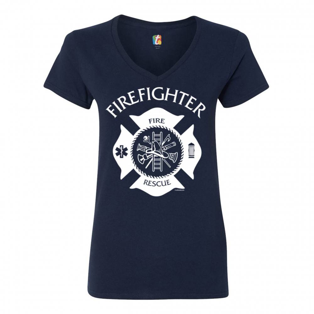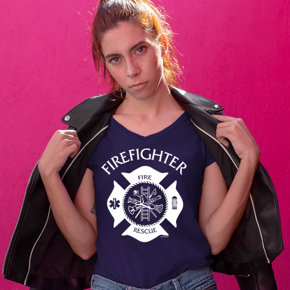 FIREFIGHTER EMBLEM women's v-neck t-shirt fire and rescue first responders tee navy blue