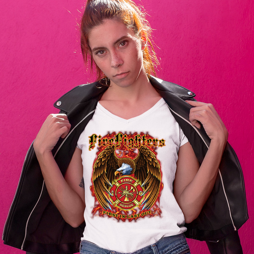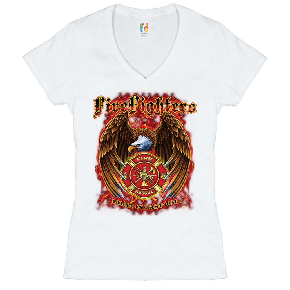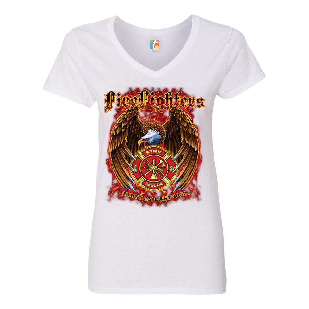 FIREFIGHTERS FIRST IN LAST OUT women's v-neck t-shirt fire and rescue tee white