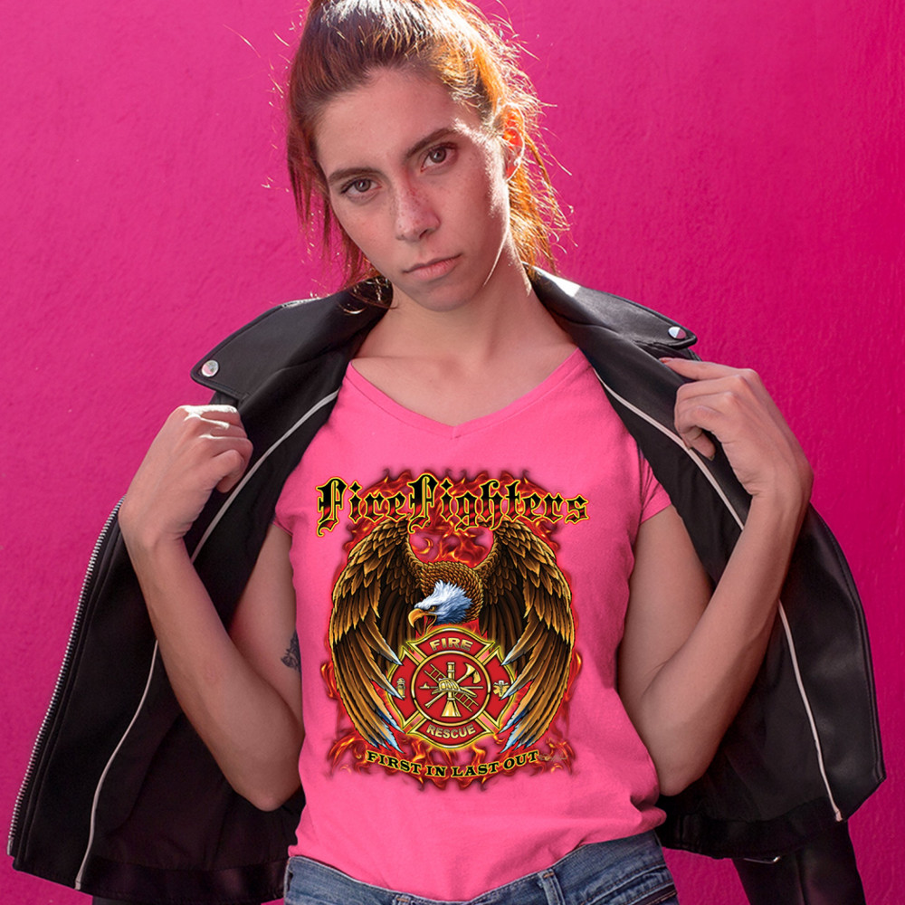 FIREFIGHTERS FIRST IN LAST OUT women's v-neck t-shirt fire and rescue tee pink