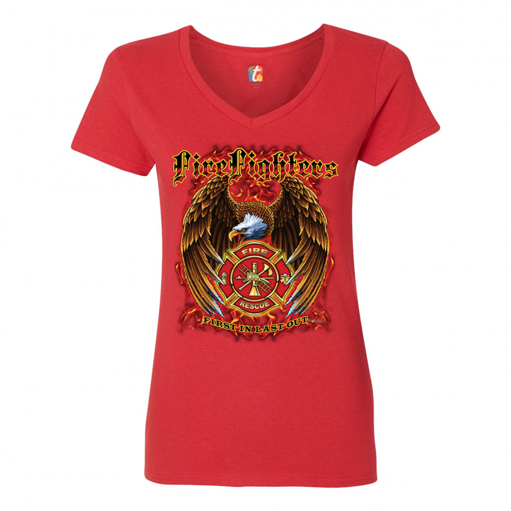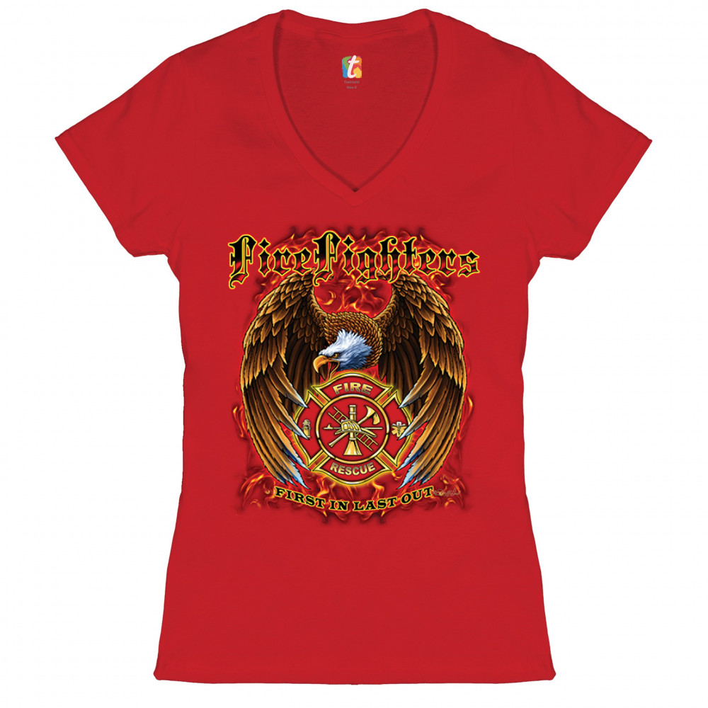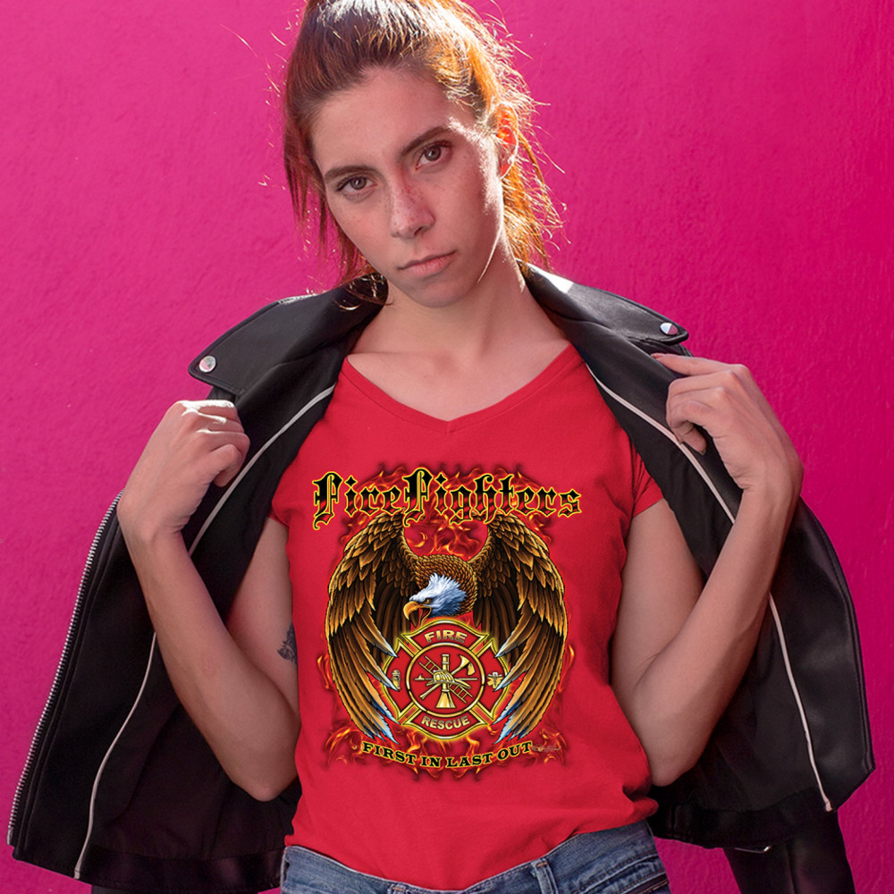 A print featuring an American Bald Eagle sitting on a firefighter emblem, which says: "Fire, Rescue". The background is engulfed in flames and the print says: "Firefighters First In Last Out". A great choice as a gift for a first responder.