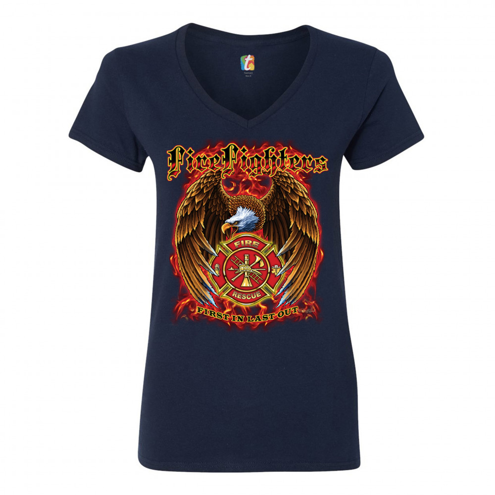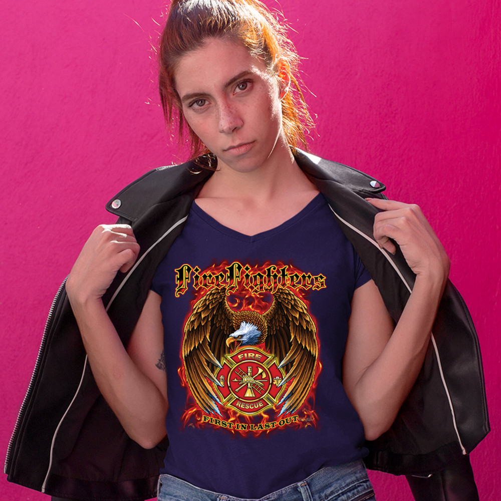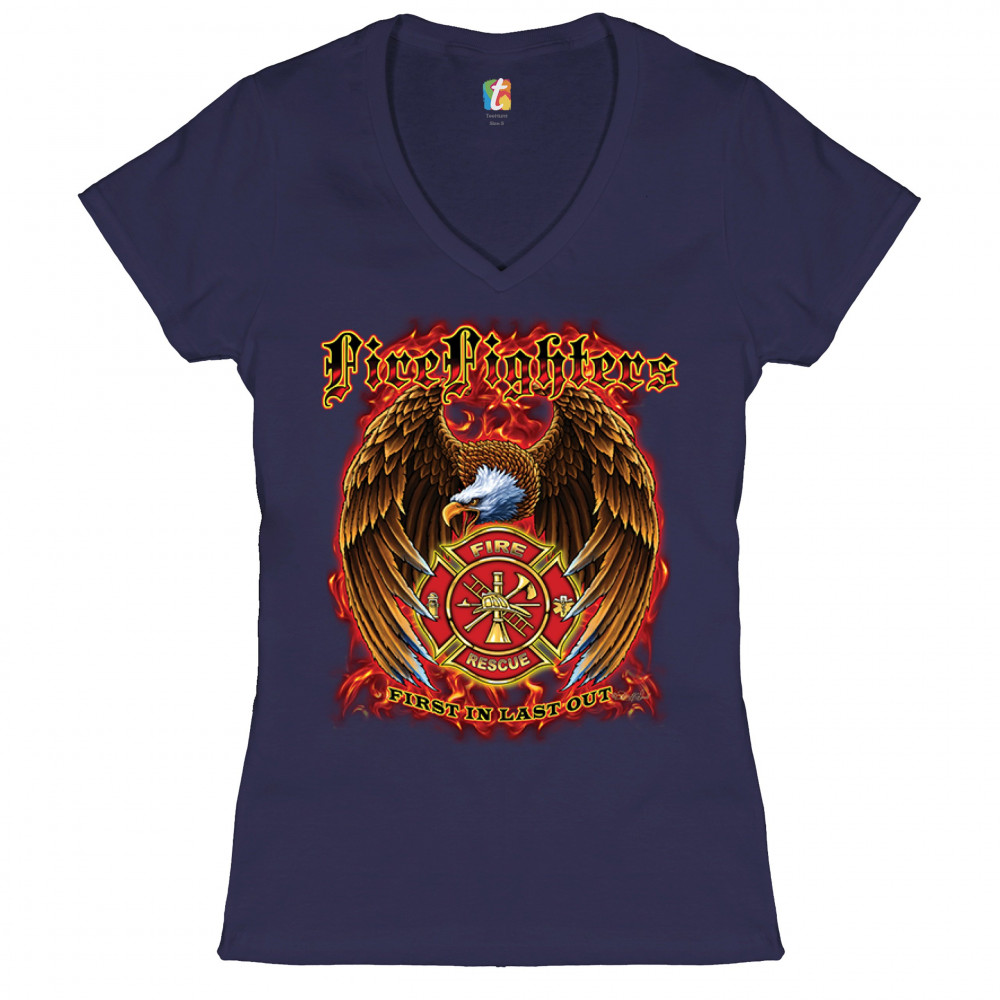 FIREFIGHTERS FIRST IN LAST OUT women's v-neck t-shirt fire and rescue tee navy blue