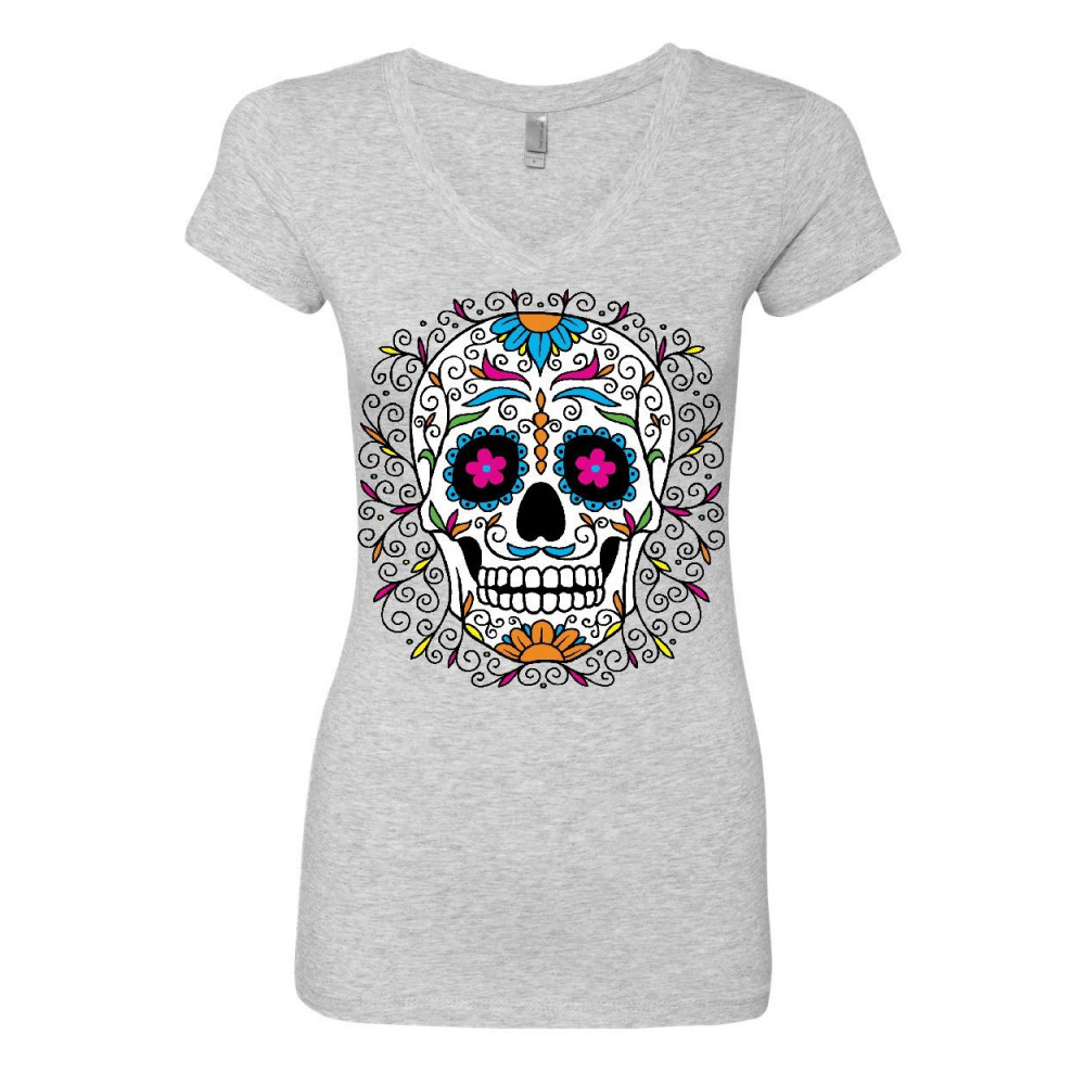 FLORAL SUGAR SKULL DAY OF THE DEAD v-neck t-shirt dia de los muertos gray