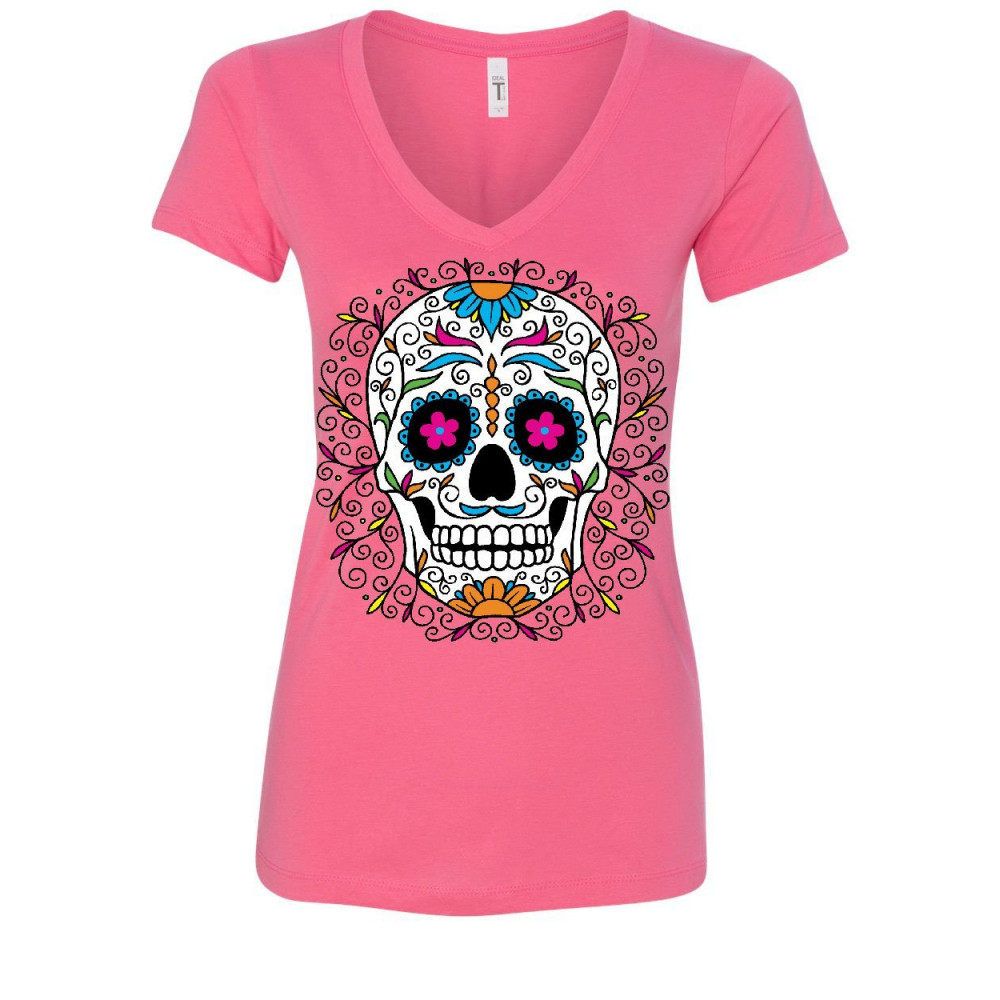 FLORAL SUGAR SKULL DAY OF THE DEAD v-neck t-shirt dia de los muertos pink