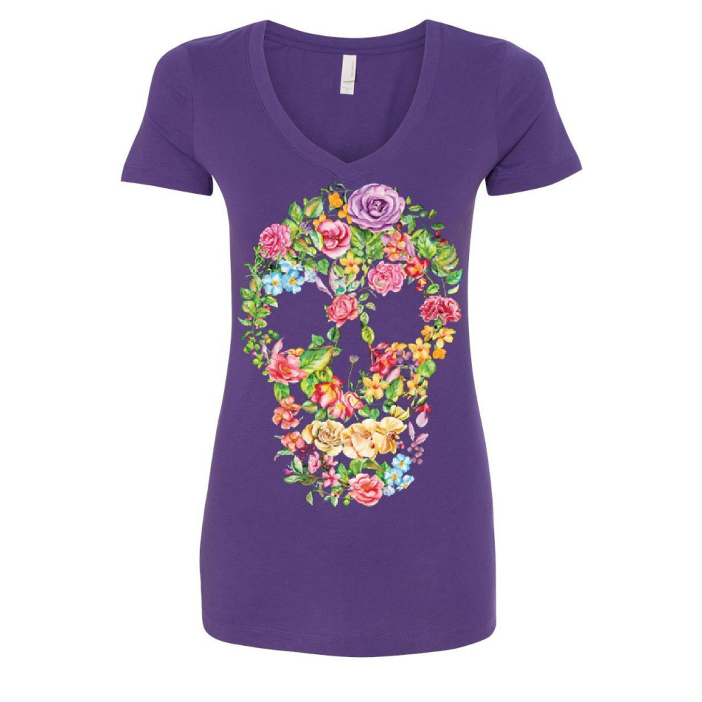 FLOWER SKULL women's v-neck t-shirt sugar skull calavera dia de los muertos purple