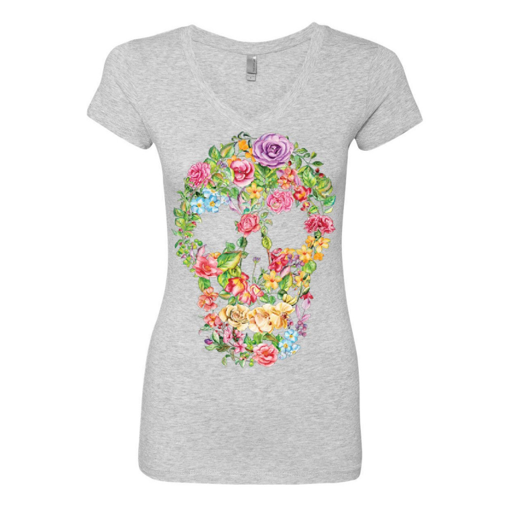FLOWER SKULL women's v-neck t-shirt sugar skull calavera dia de los muertos gray