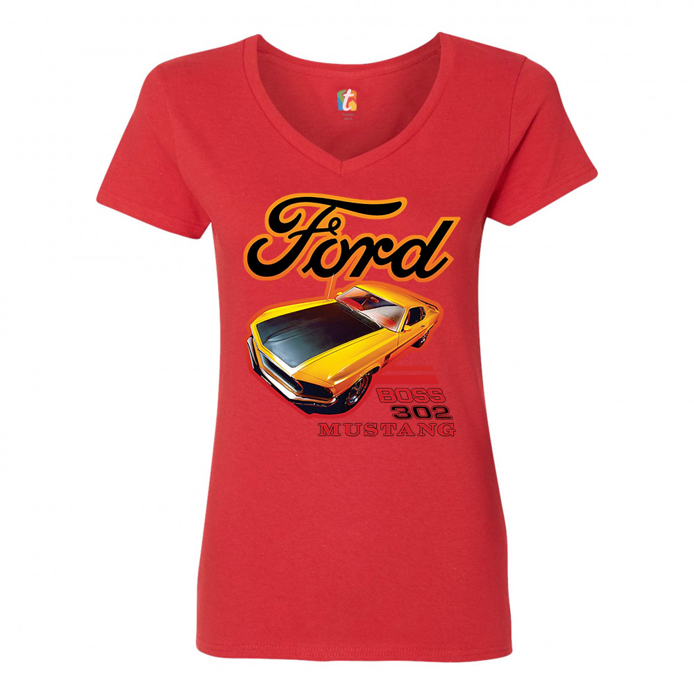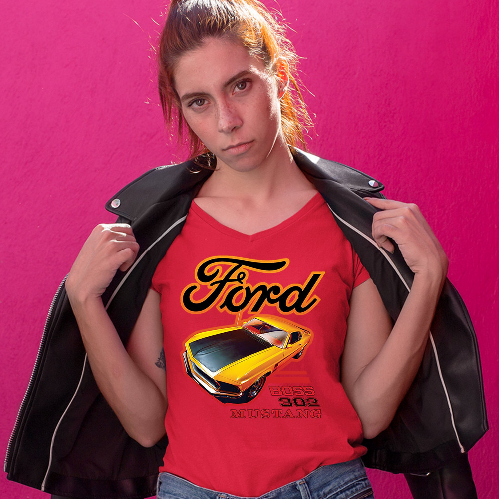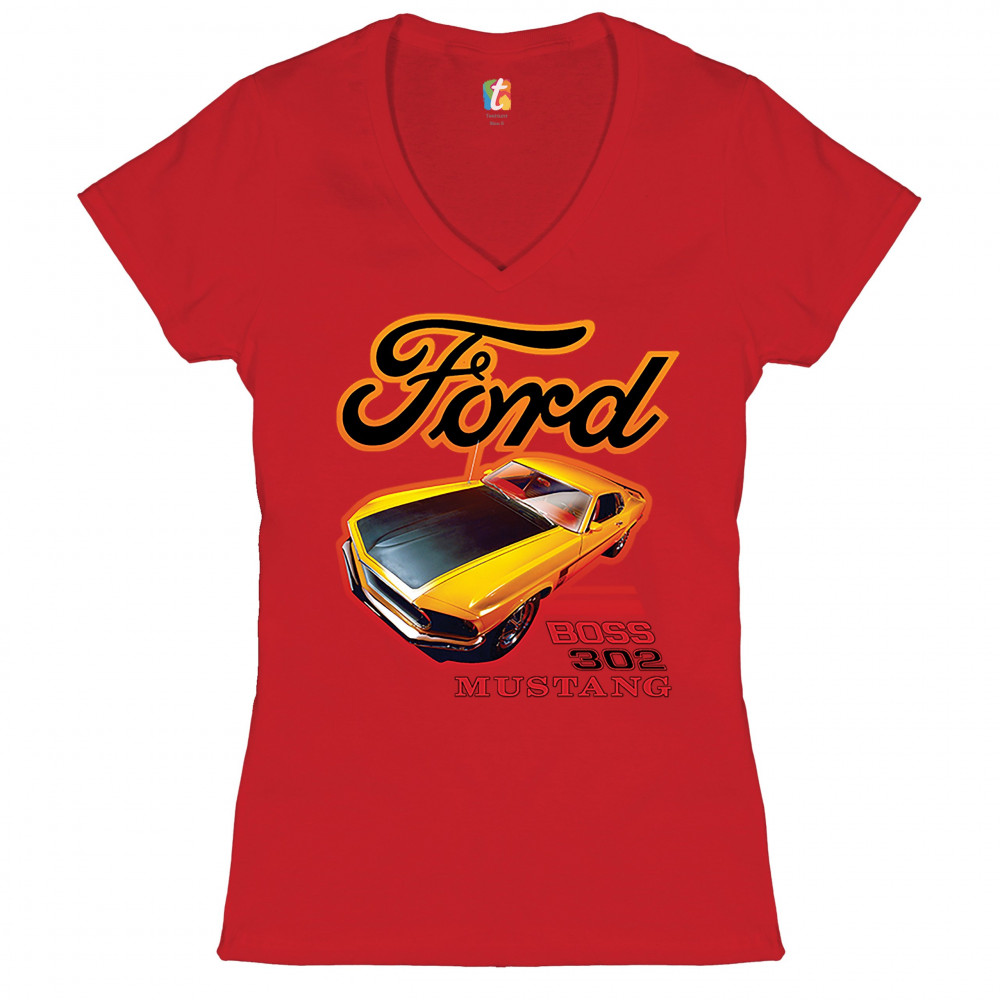 FORD BOSS 302 MUSTANG women's v-neck t-shirt american muscle car licensed tee red