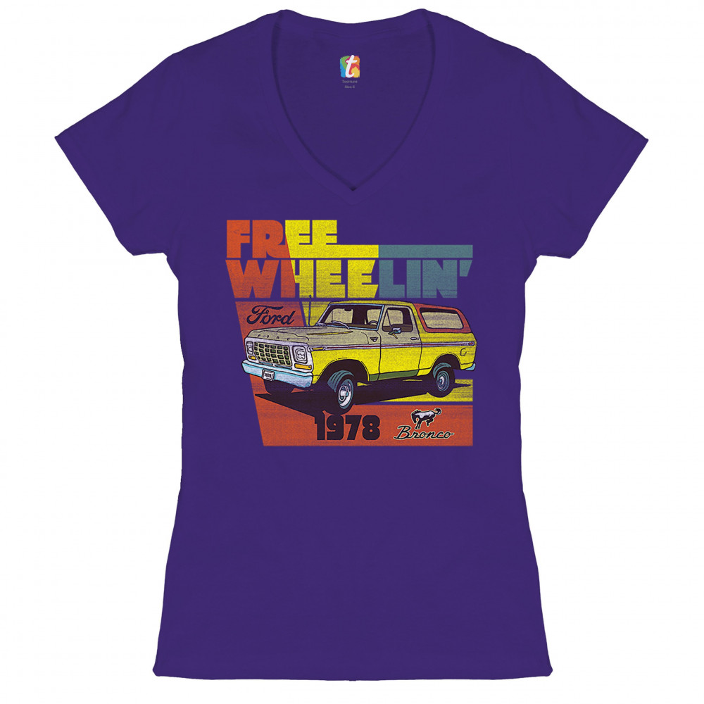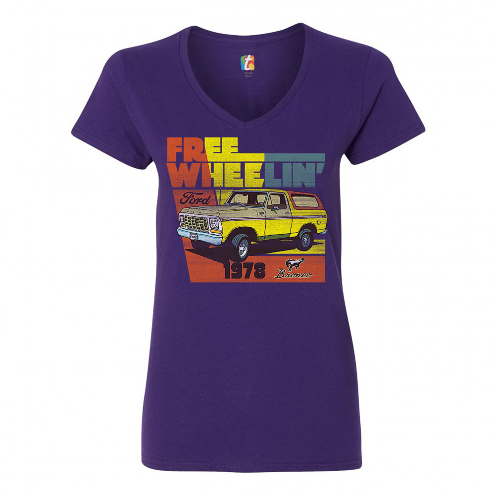 FORD BRONCO 1978 women's v-neck t-shirt free wheelin' truck suv licensed tee purple