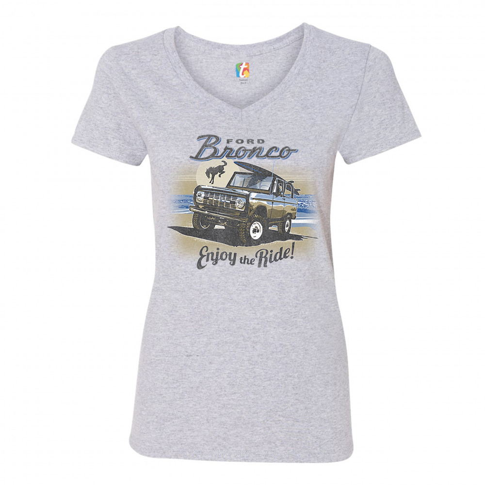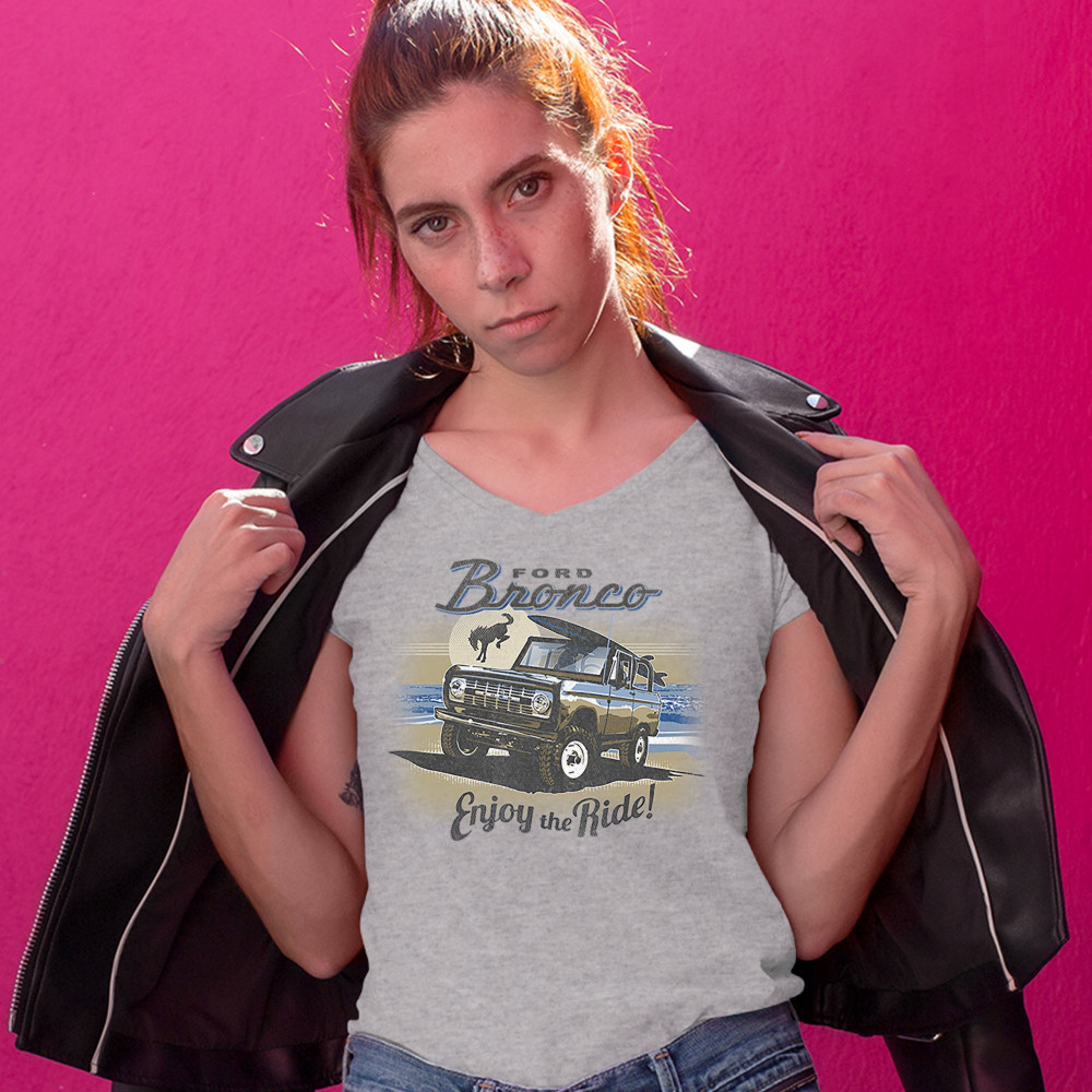 A print featuring a Ford Bronco parked at a beach with a surfboard on it's roof. The print says: "Ford Bronco" and "Enhoy the Ride!". There is a Bronco logo by the windshield. A great choice for any Ford owner who is passionate about powerful trucks and o