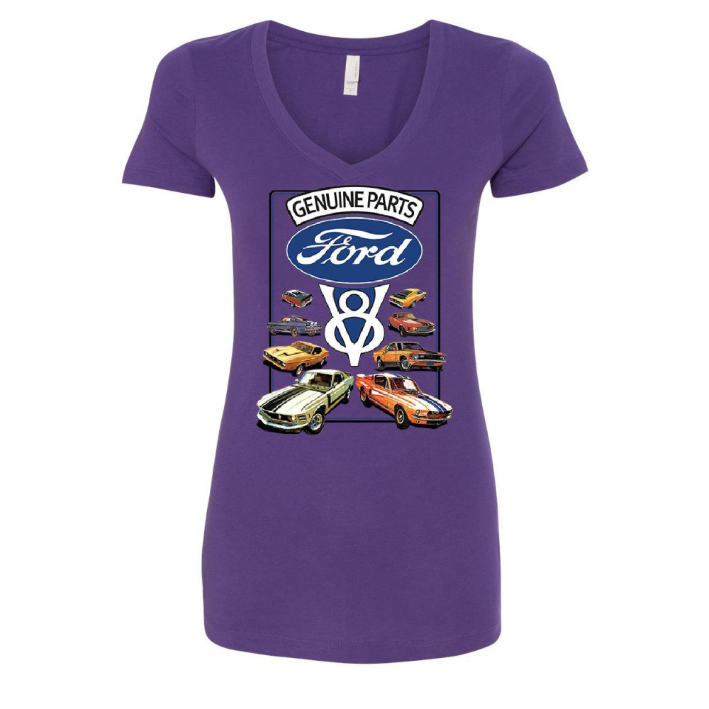 FORD GENUINE PARTS women's v-neck t-shirt american classic muscle cars v8 motor purple