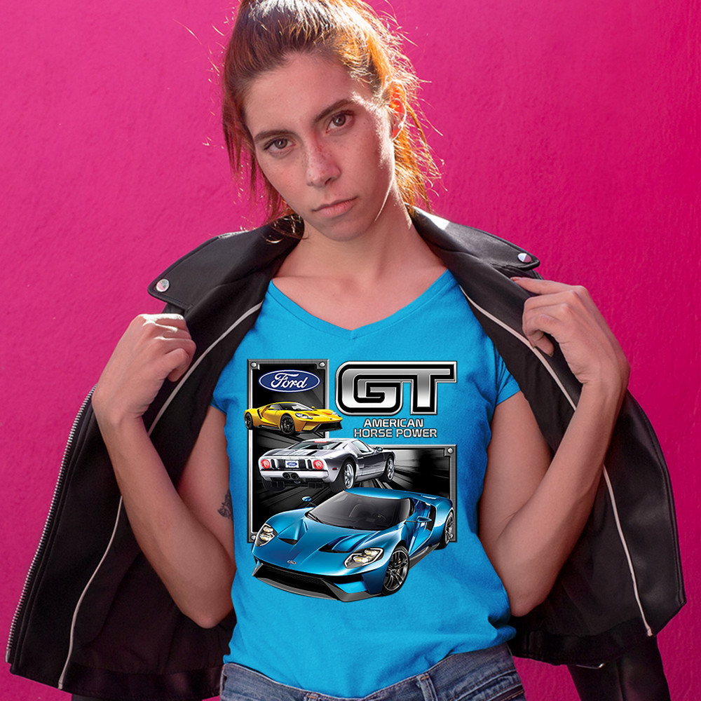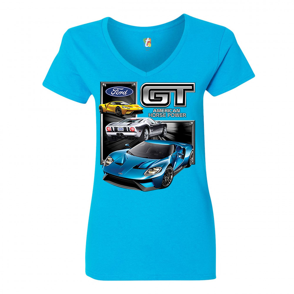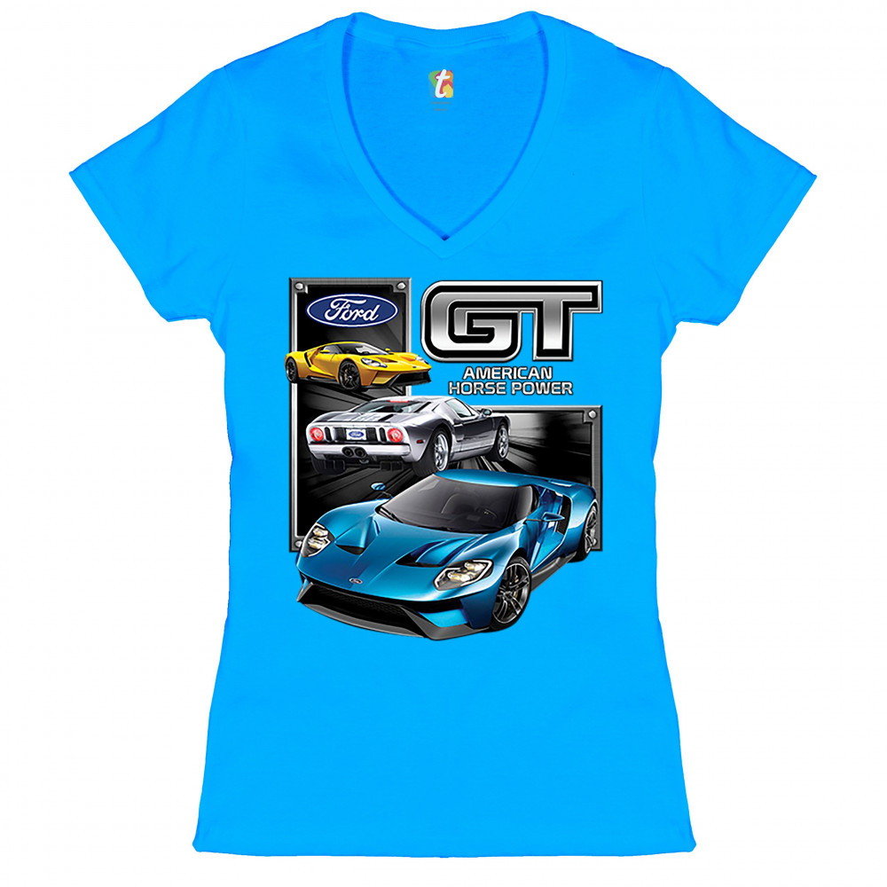 FORD GT AMERICAN HORSE POWER women's v-neck t-shirt race car licensed tee turquoise