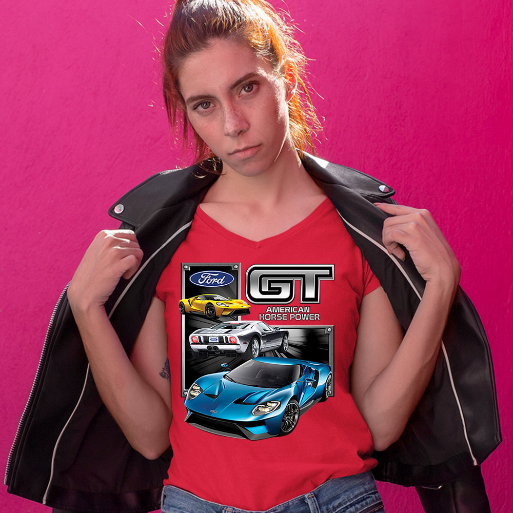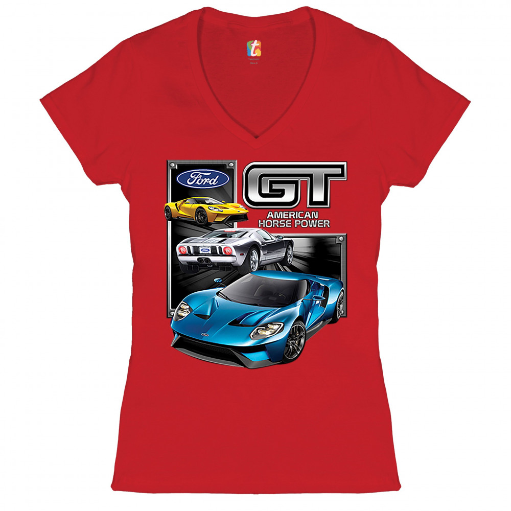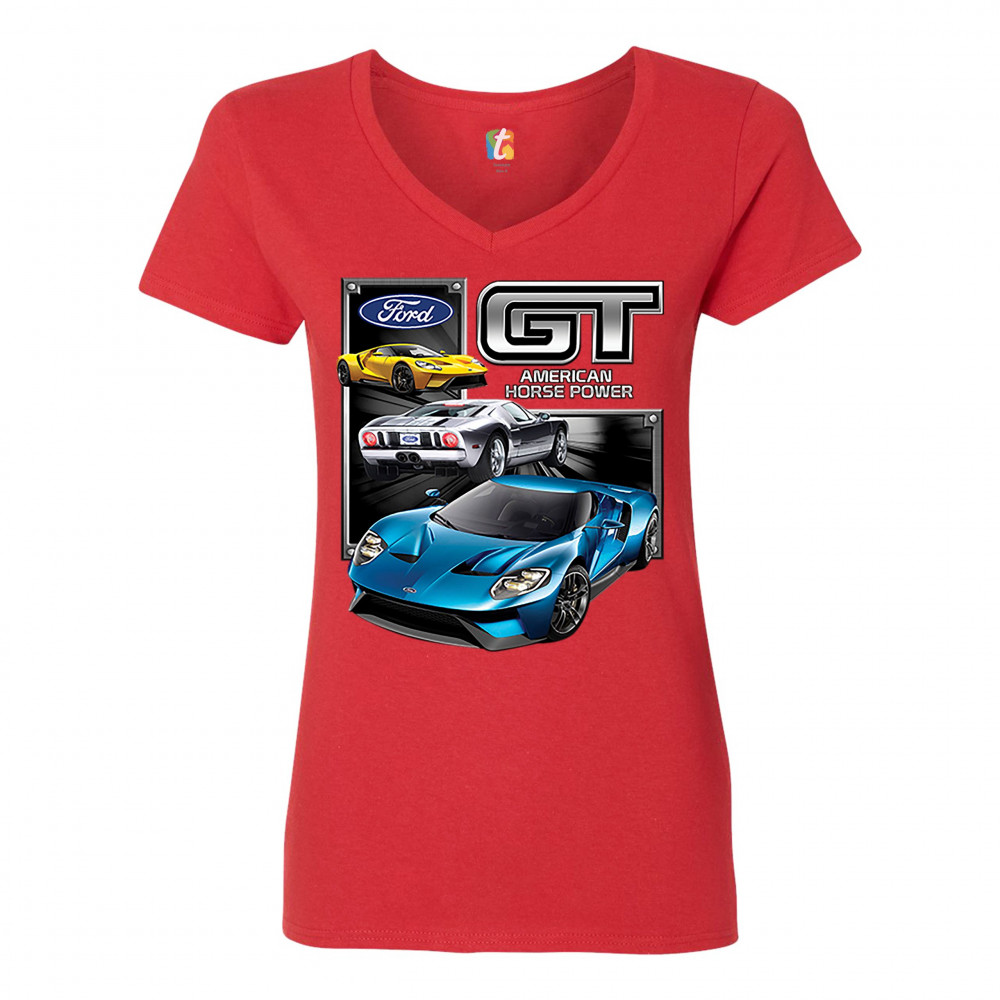 FORD GT AMERICAN HORSE POWER women's v-neck t-shirt race car licensed tee red