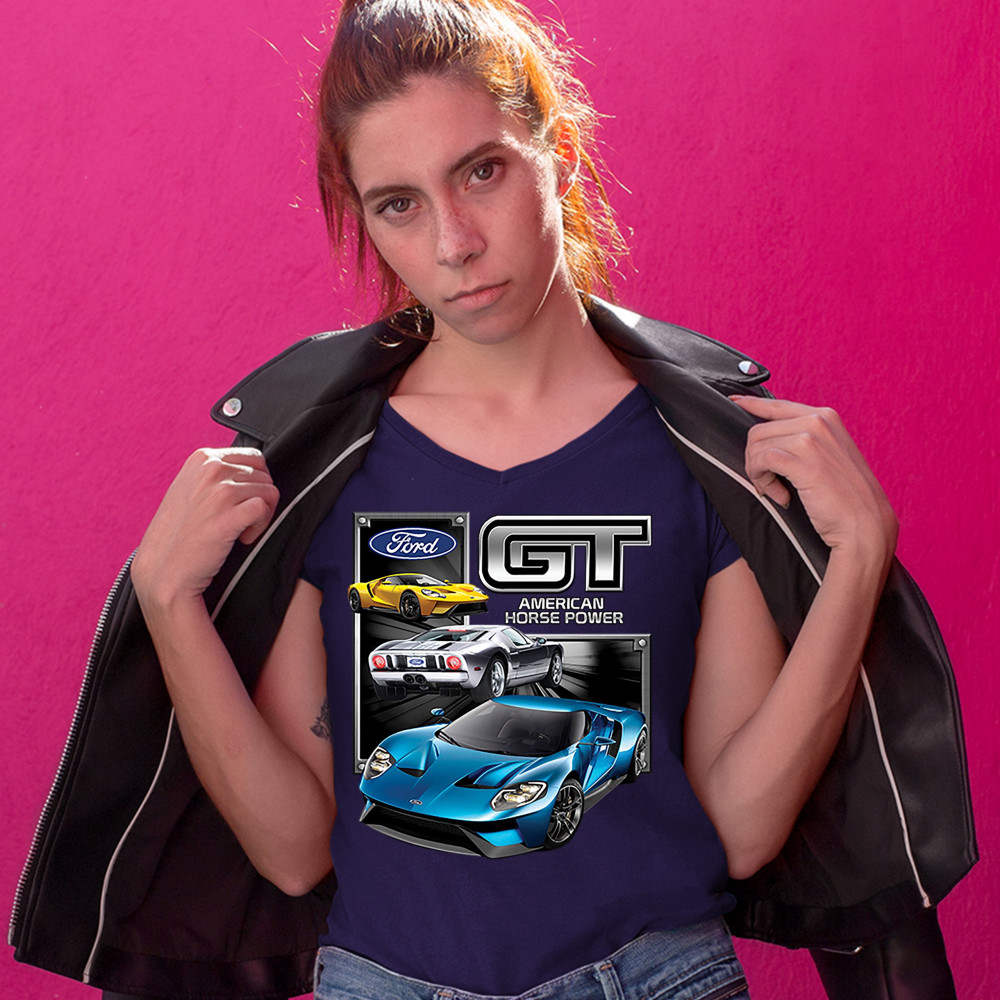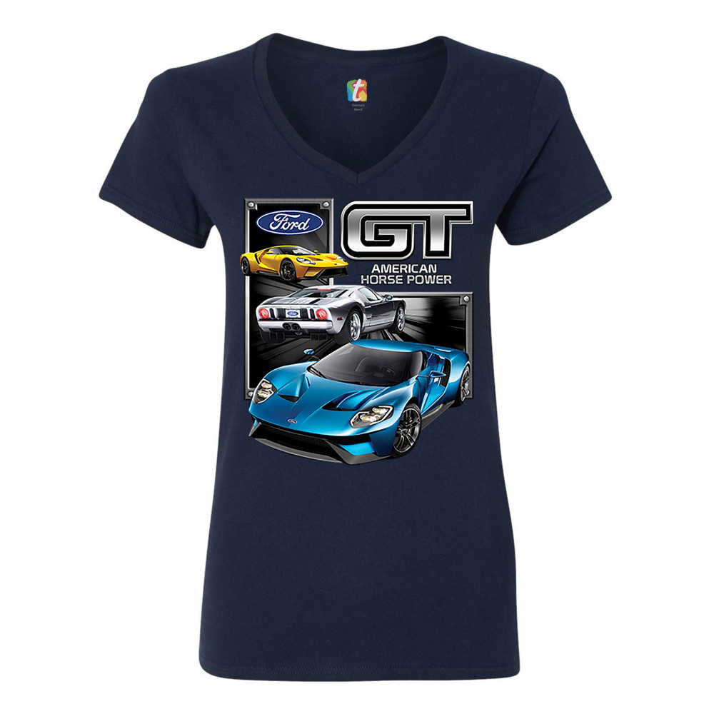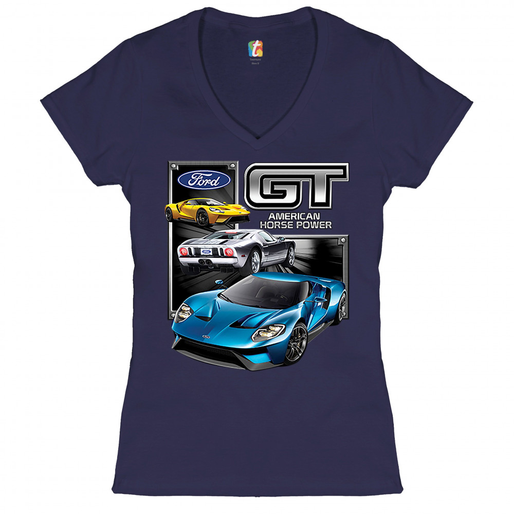 FORD GT AMERICAN HORSE POWER women's v-neck t-shirt race car licensed tee navy blue