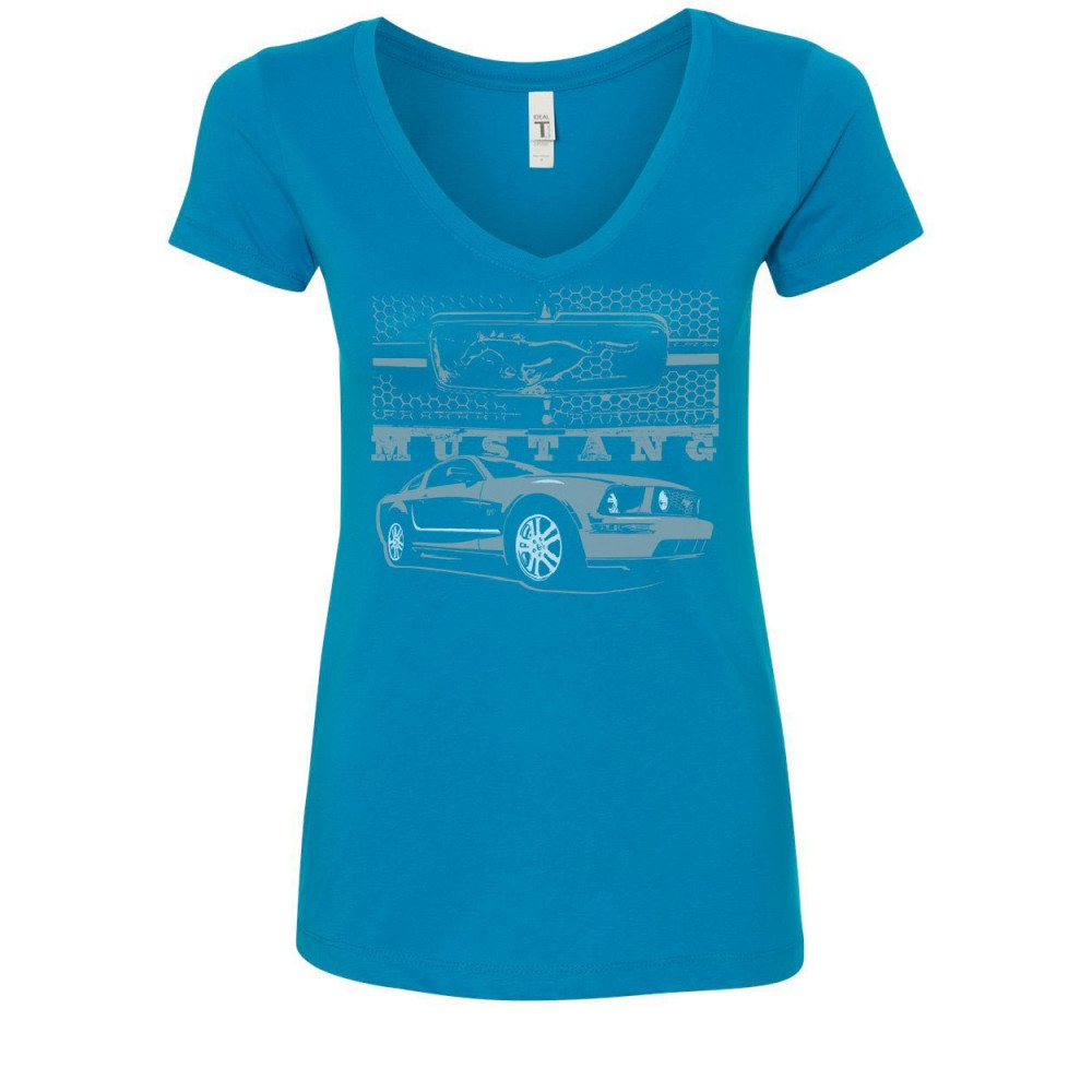 FORD HONEYCOMB GRILLE women's v-neck t-shirt mustang silhouette us muscle car turquoise