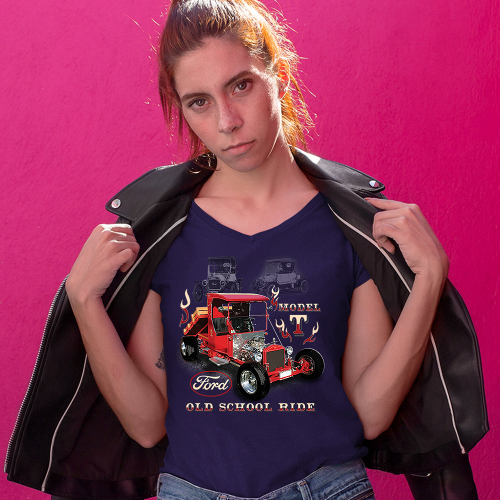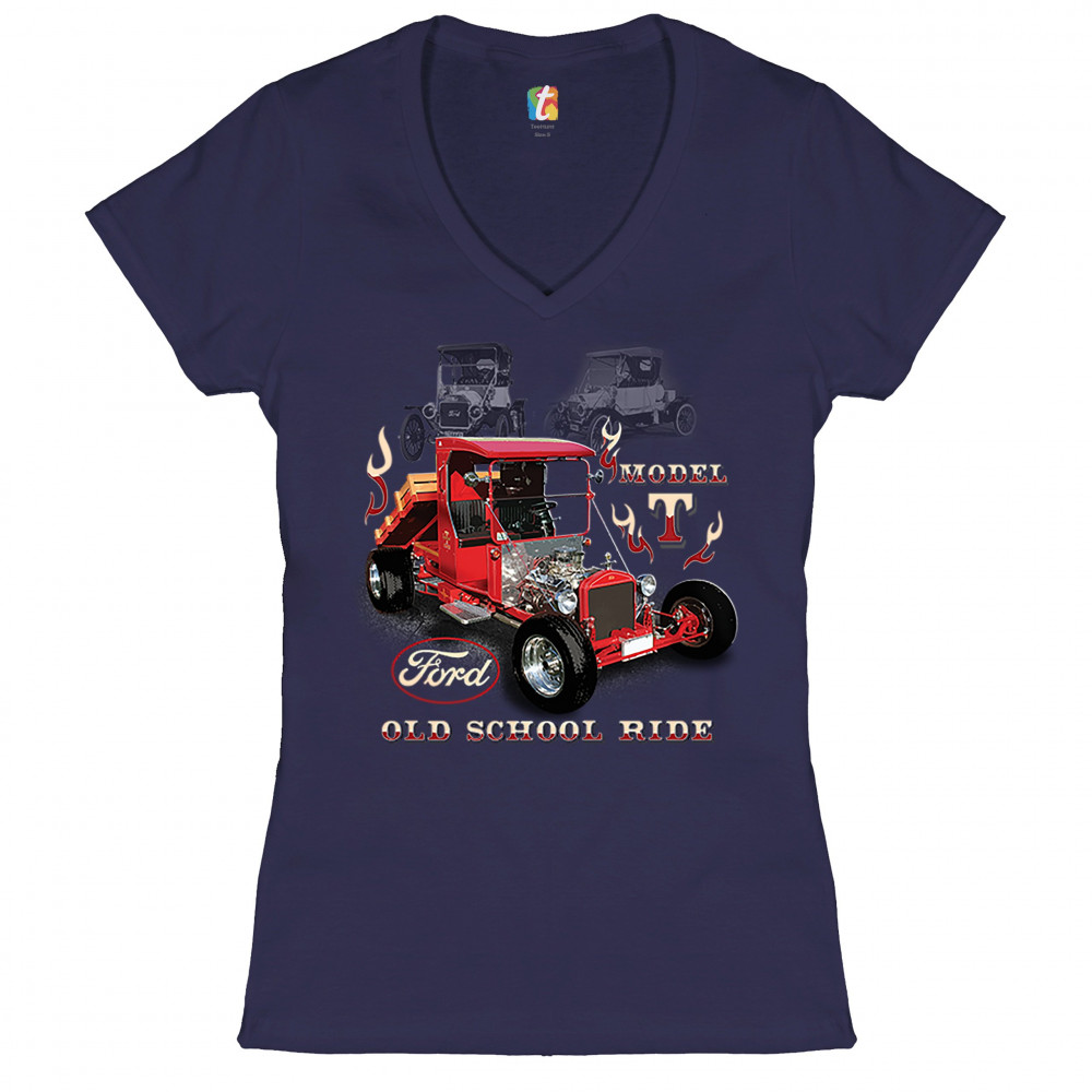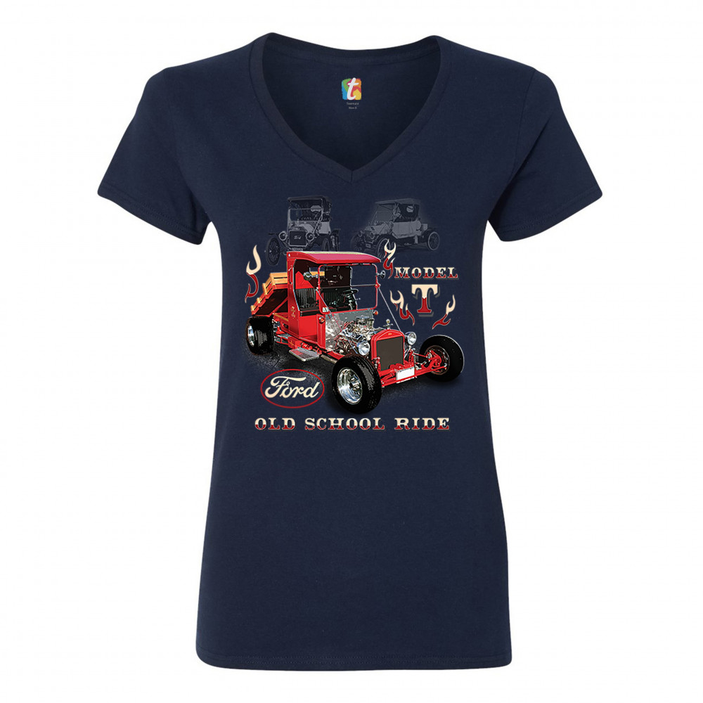 FORD MODEL T OLD SCHOOL RIDE women's v-neck t-shirt retro hot rod licensed tee navy blue