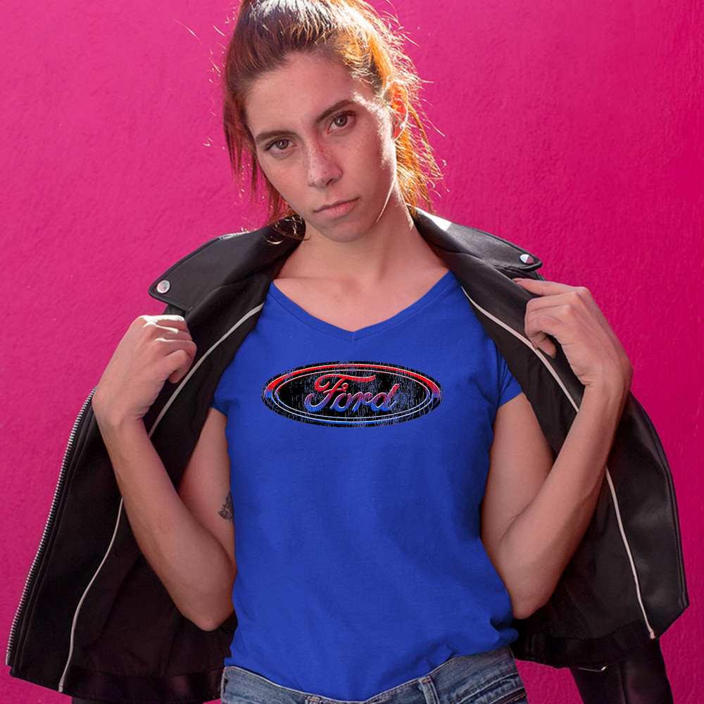 FORD MOTOR COMPANY LOGO women's v-neck t-shirt american made cars licensed tee royal blue