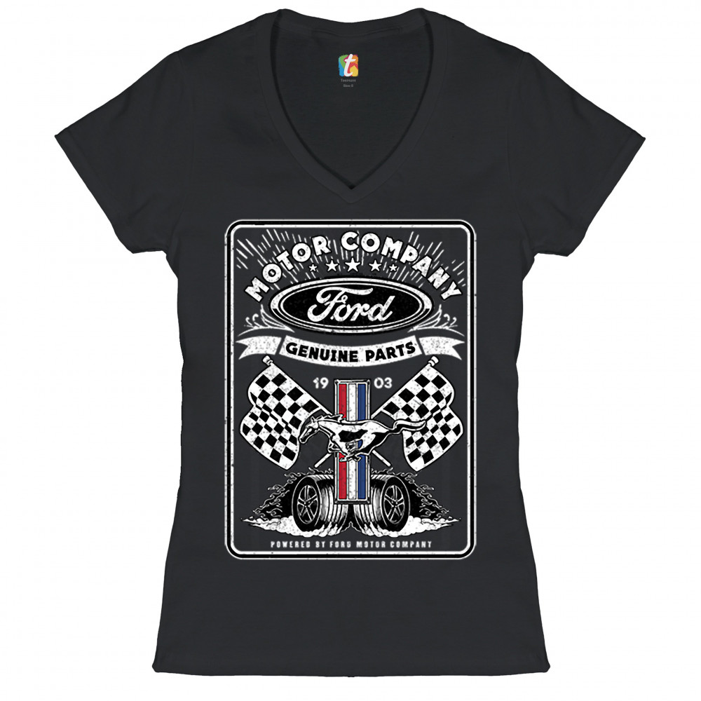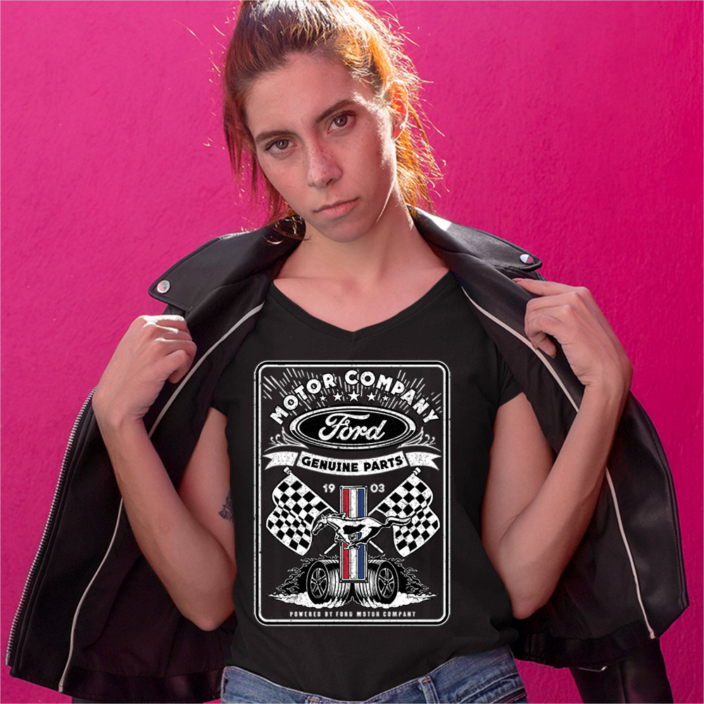 A print featuring Ford logo in the top, Mustang logo in the center, two racing flags and two rolling wheels. The prints says: "Ford Motor Company Genuine Parts 1903" in the top and "Powered by Ford Motor Company" in the bottom. A great choice for anyone w