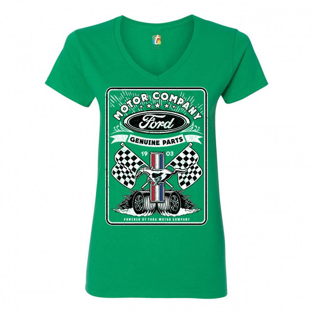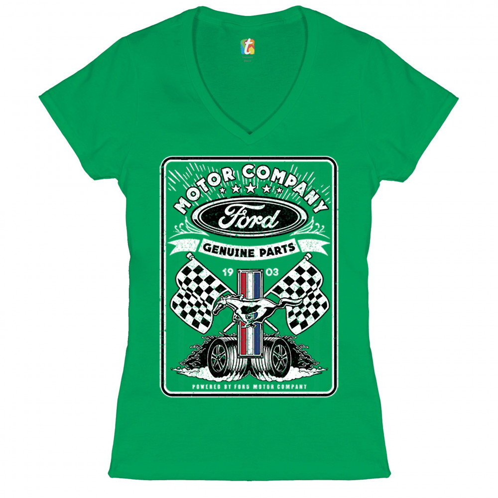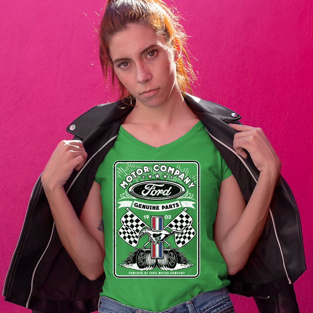 A print featuring Ford logo in the top, Mustang logo in the center, two racing flags and two rolling wheels. The prints says: "Ford Motor Company Genuine Parts 1903" in the top and "Powered by Ford Motor Company" in the bottom. A great choice for anyone w