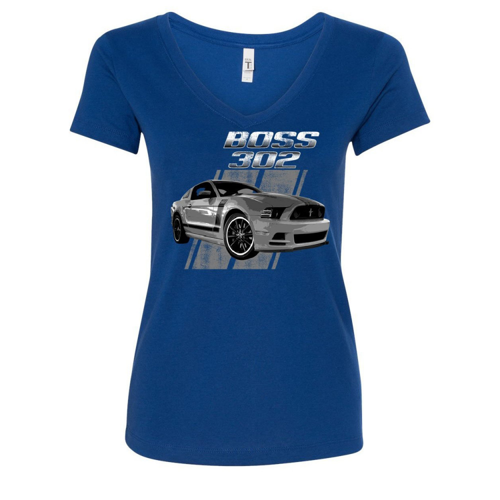 FORD MUSTANG BOSS 302 women's v-neck t-shirt 50 years anniversary muscle car royal blue