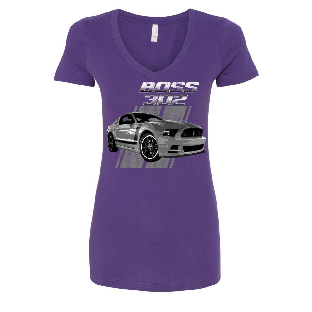 FORD MUSTANG BOSS 302 women's v-neck t-shirt 50 years anniversary muscle car purple