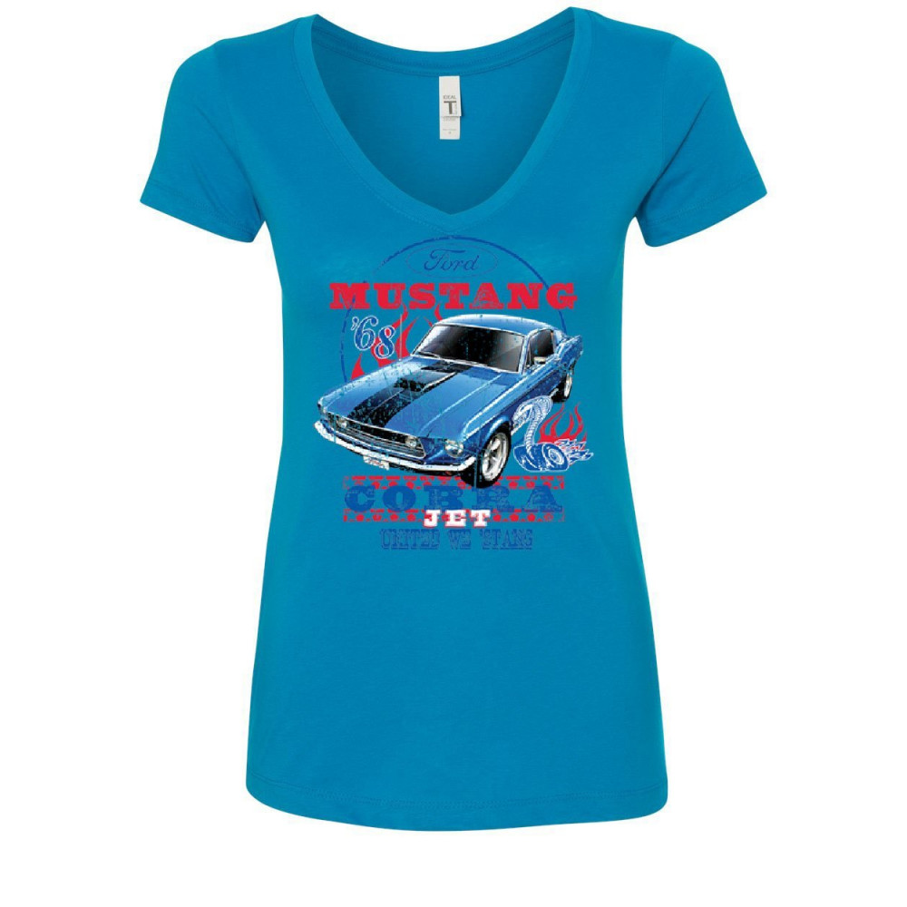 FORD MUSTANG COBRA 1968 women's v-neck t-shirt united we stang american classic turquoise