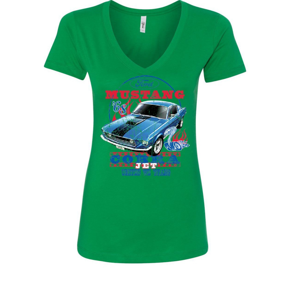 FORD MUSTANG COBRA 1968 women's v-neck t-shirt united we stang american classic green