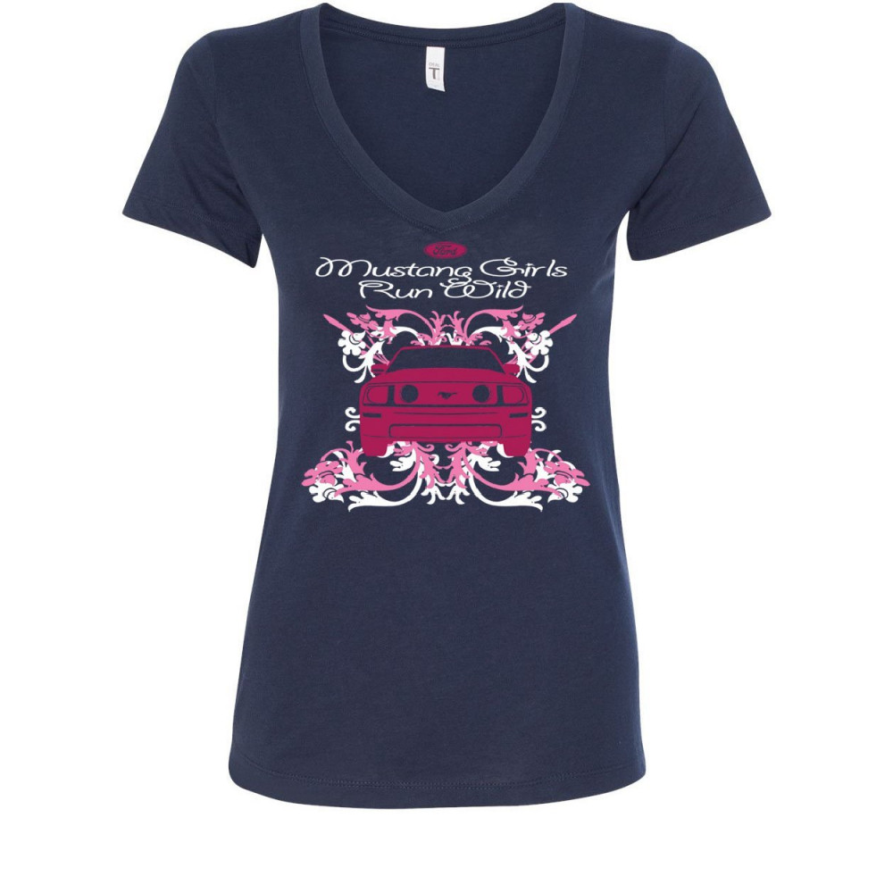 FORD MUSTANG GIRLS RUN WILD women's v-neck t-shirt pink american muscle car navy blue