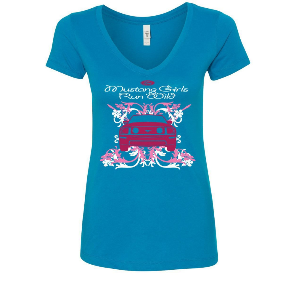 FORD MUSTANG GIRLS RUN WILD women's v-neck t-shirt pink american muscle car turquoise