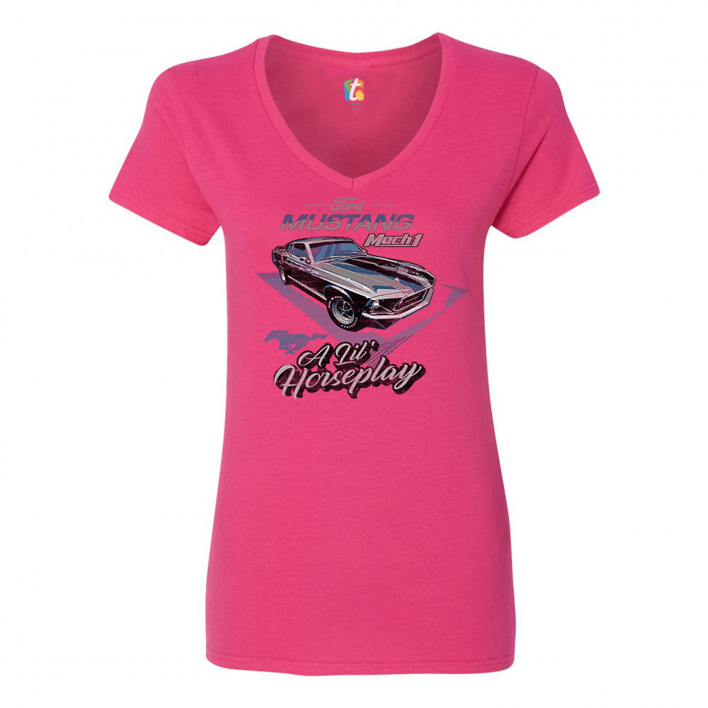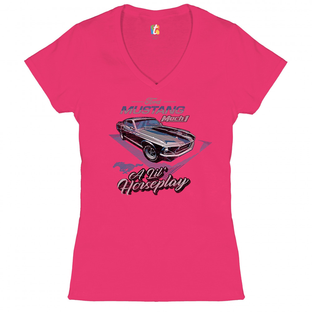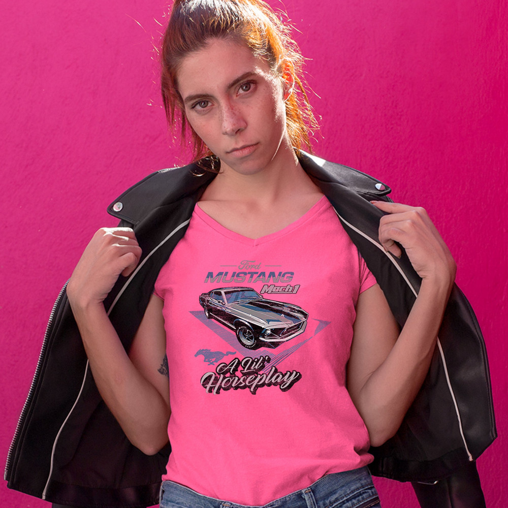 FORD MUSTANG MACH 1 A LIL' HORSEPLAY women's v-neck t-shirt retro licensed tee pink