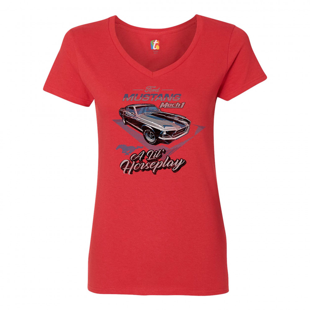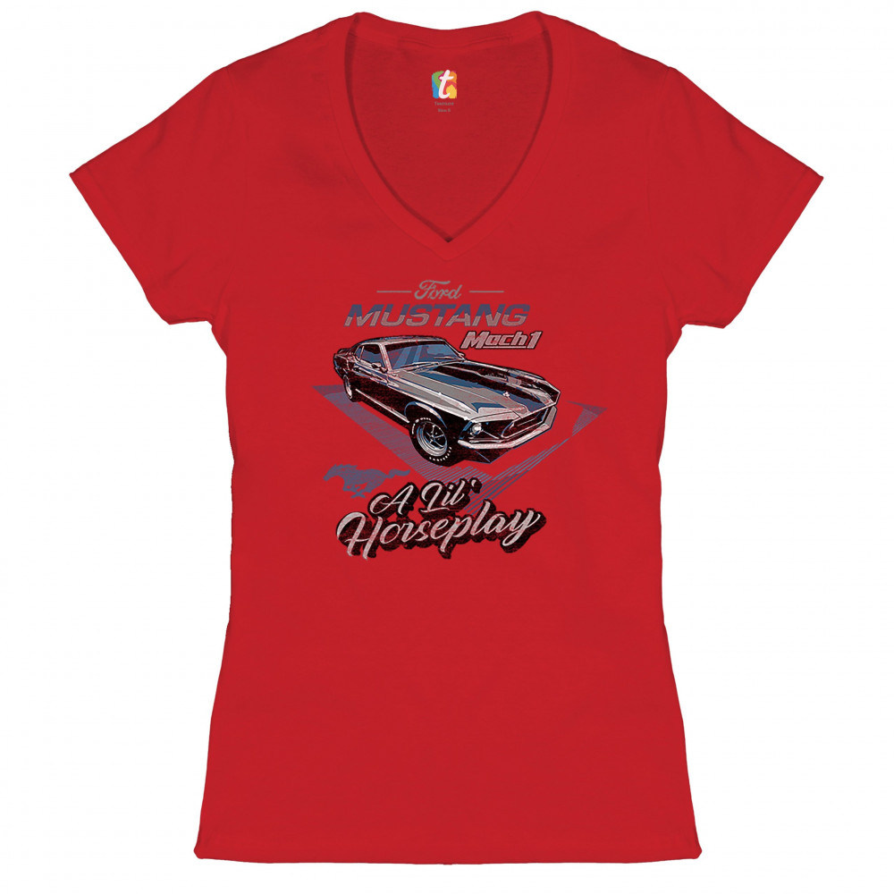FORD MUSTANG MACH 1 A LIL' HORSEPLAY women's v-neck t-shirt retro licensed tee red