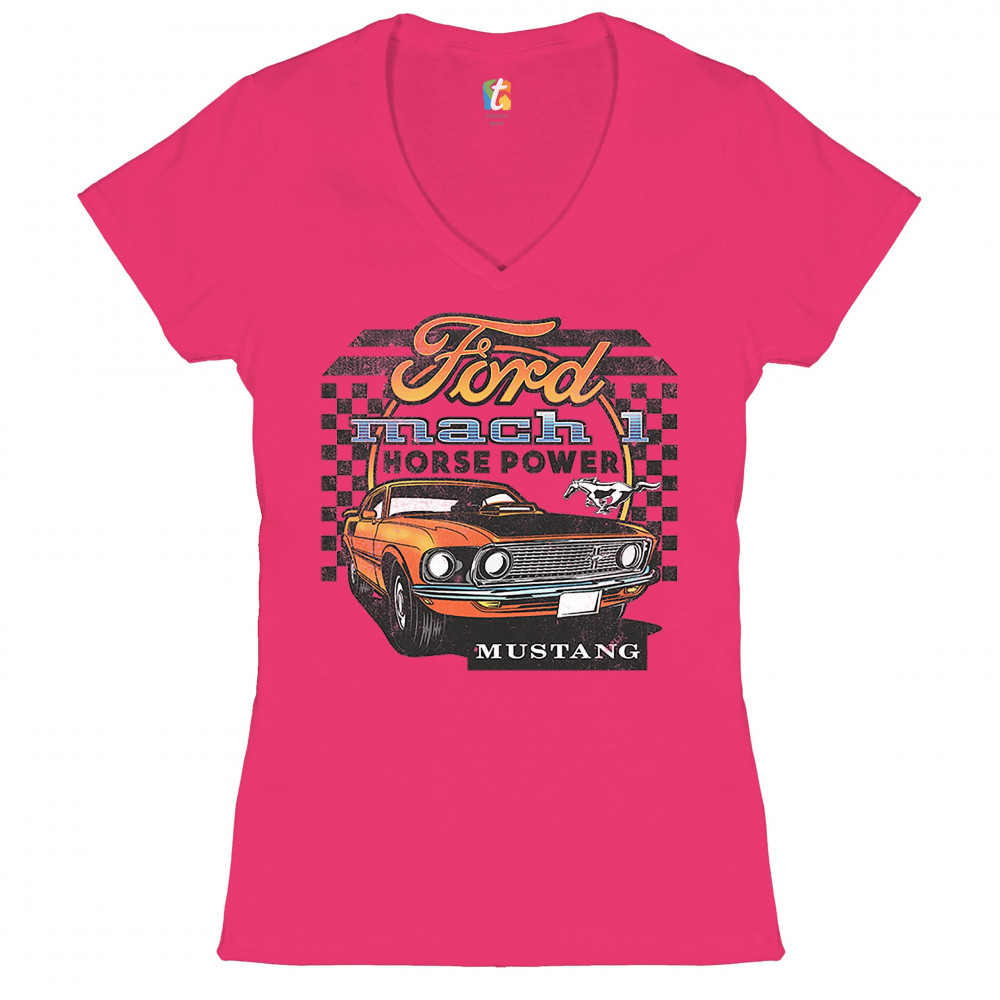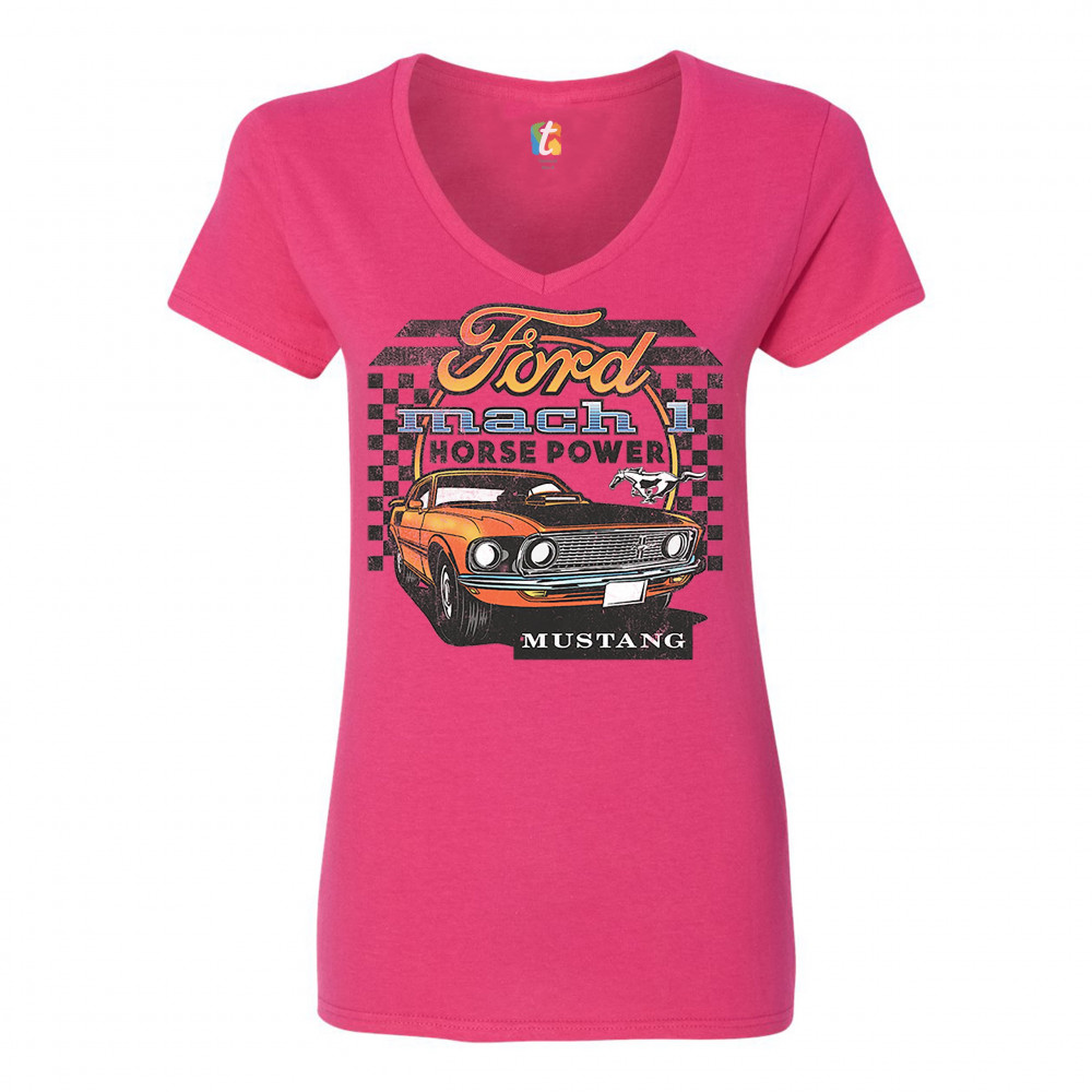 FORD MUSTANG MACH 1 women's v-neck t-shirt horse power muscle car licensed tee pink