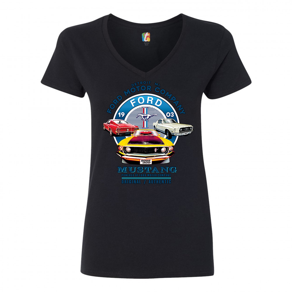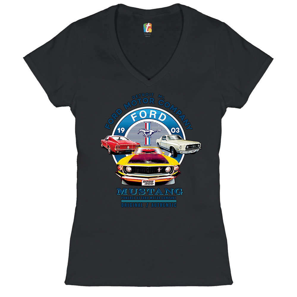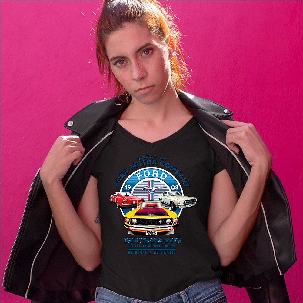 A print featuring three classic Ford Mustangs and their logo in the center. The print says: "Detroit Mi. Ford Motor Company, 1903 Ford Mustang, Powered by Ford Motor Company, Original/Authentic". A great choice for anyone who is a fan of old school Ford M