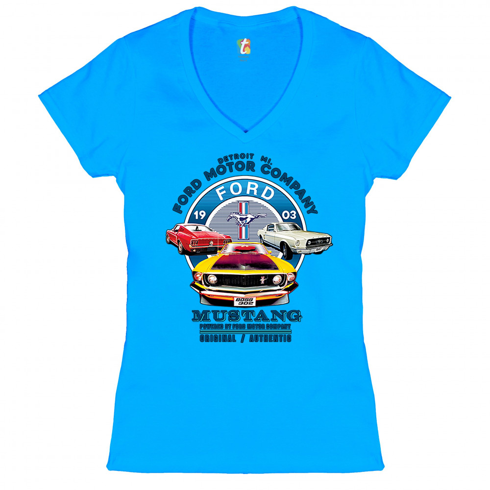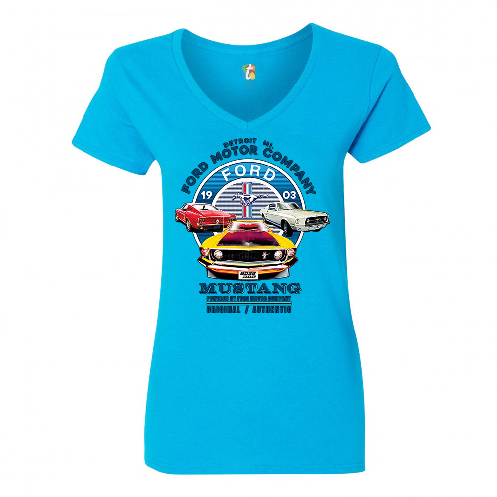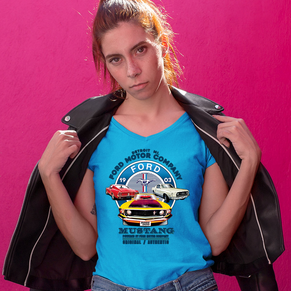A print featuring three classic Ford Mustangs and their logo in the center. The print says: "Detroit Mi. Ford Motor Company, 1903 Ford Mustang, Powered by Ford Motor Company, Original/Authentic". A great choice for anyone who is a fan of old school Ford M