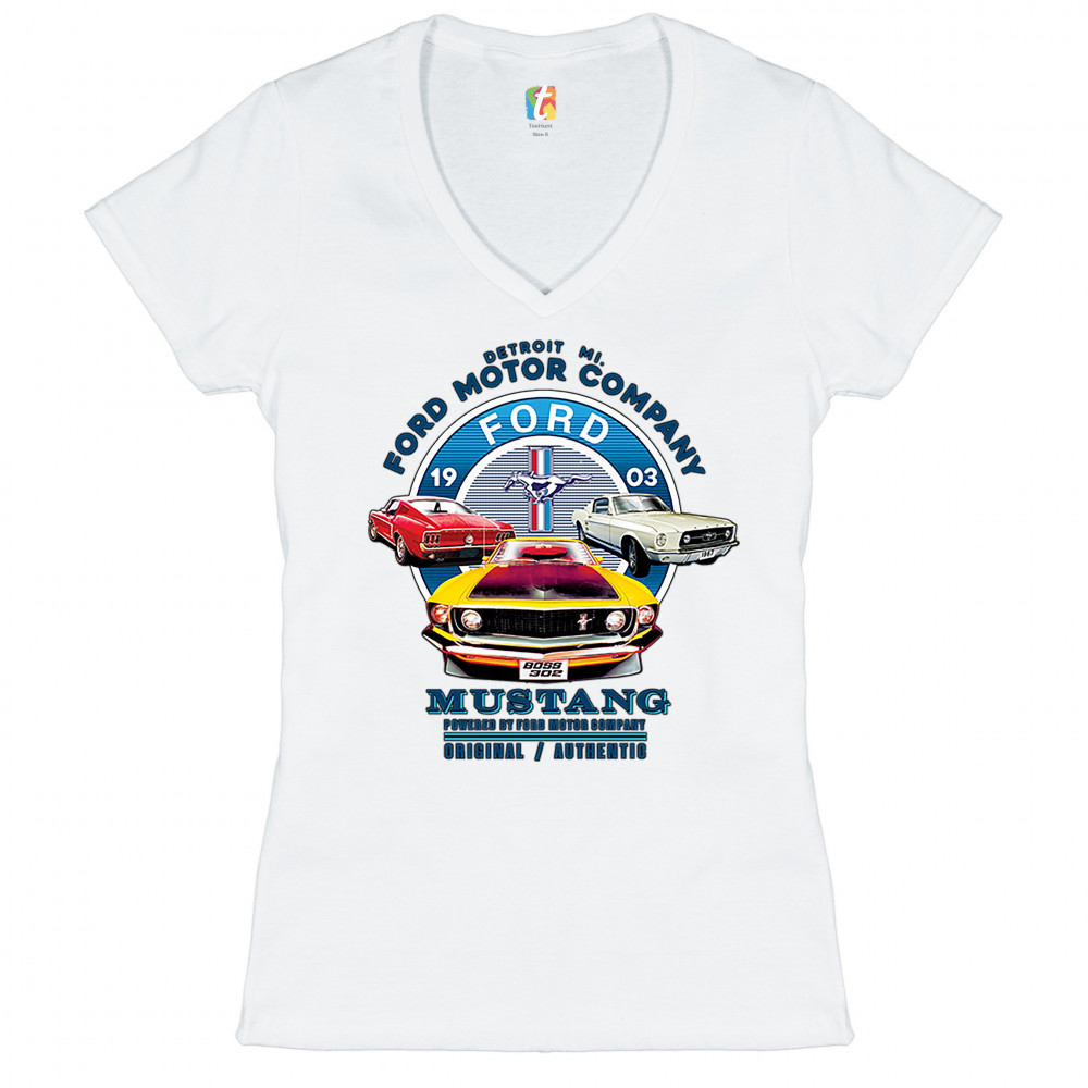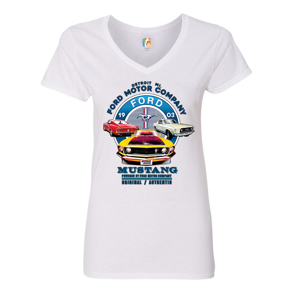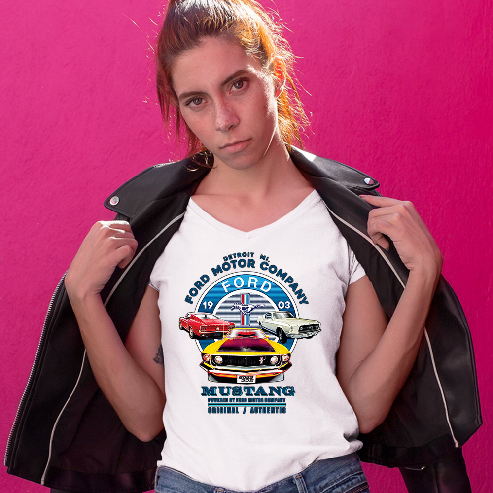A print featuring three classic Ford Mustangs and their logo in the center. The print says: "Detroit Mi. Ford Motor Company, 1903 Ford Mustang, Powered by Ford Motor Company, Original/Authentic". A great choice for anyone who is a fan of old school Ford M