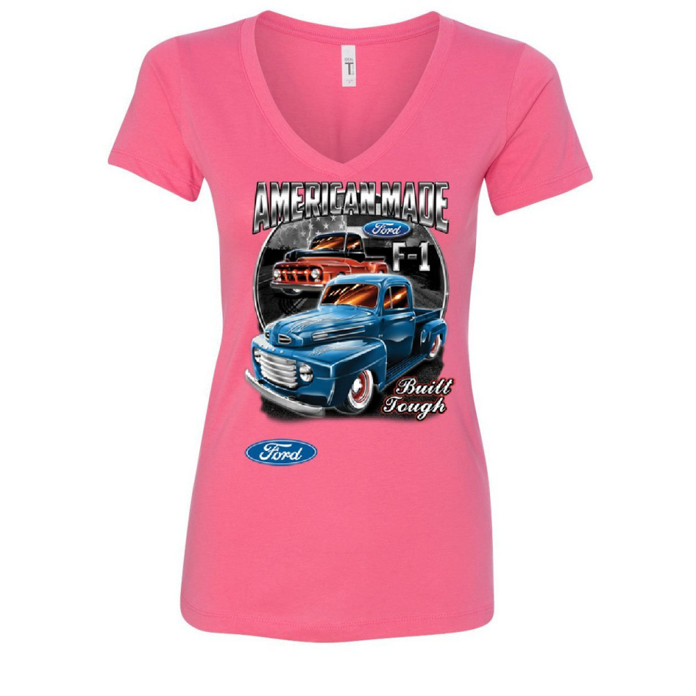 FORD PICKUP TRUCKS F1 women's v-neck t-shirt american made hot rod built tough pink