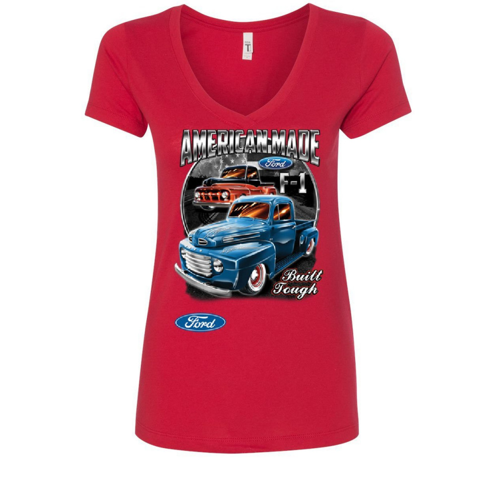 FORD PICKUP TRUCKS F1 women's v-neck t-shirt american made hot rod built tough red