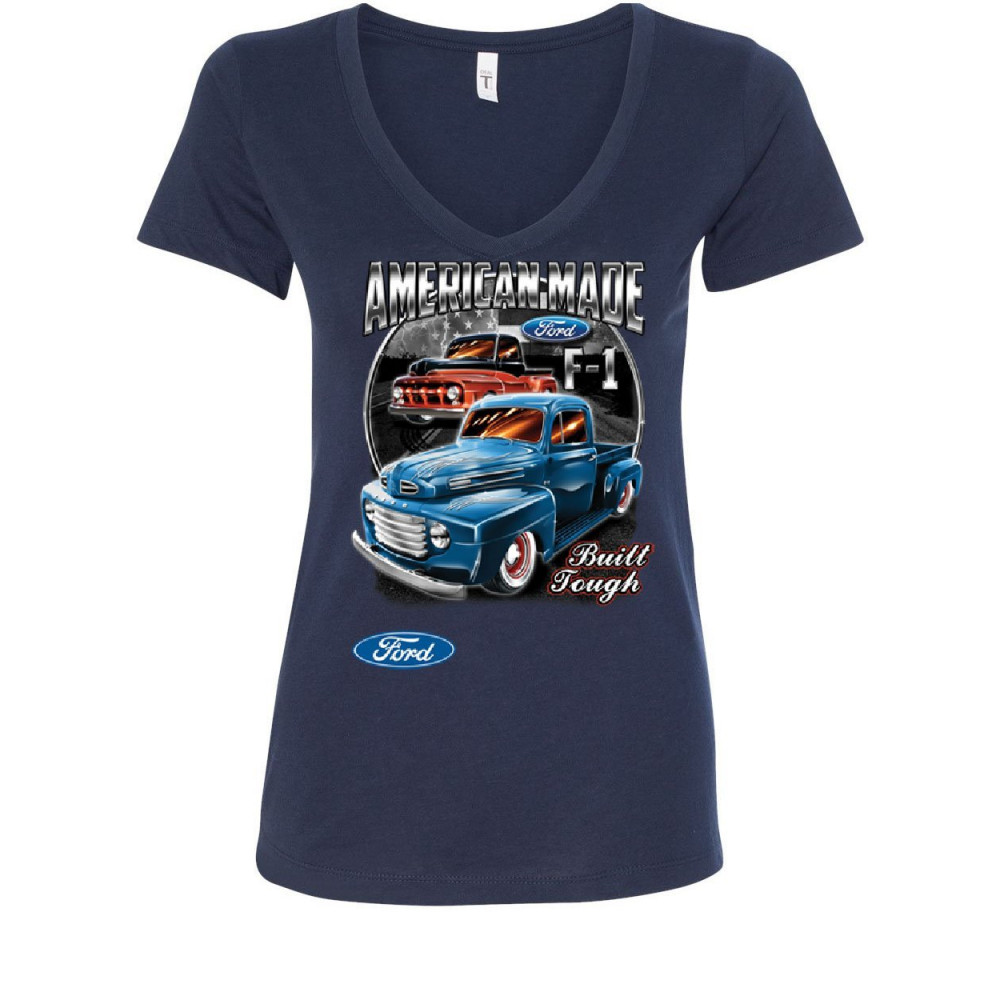 FORD PICKUP TRUCKS F1 women's v-neck t-shirt american made hot rod built tough navy blue
