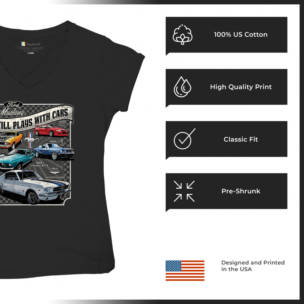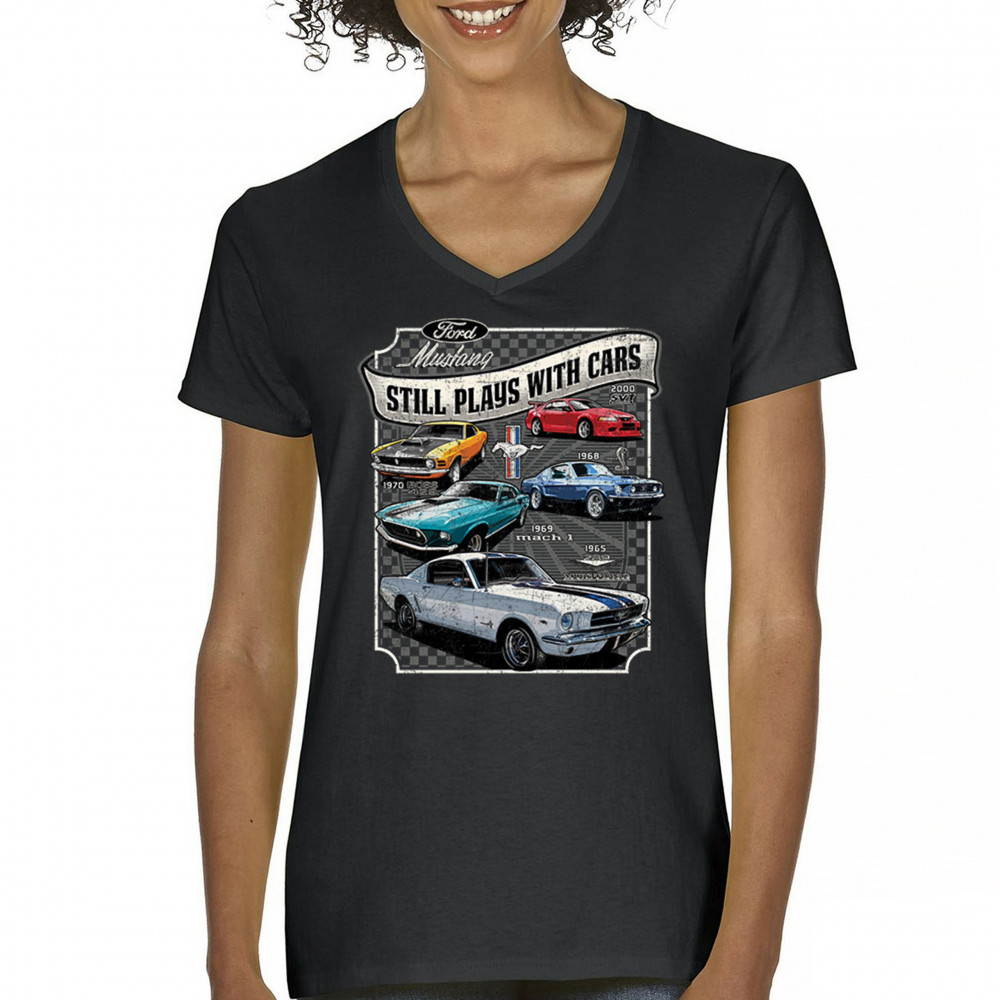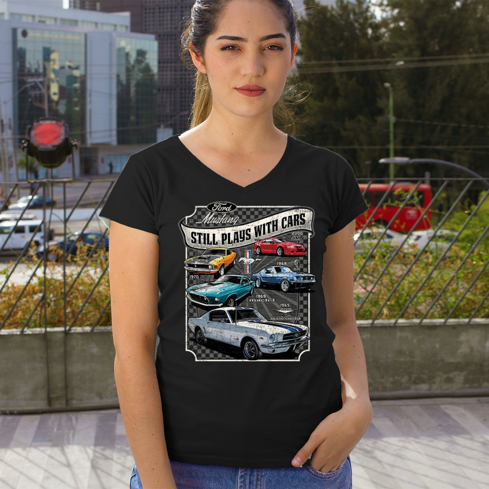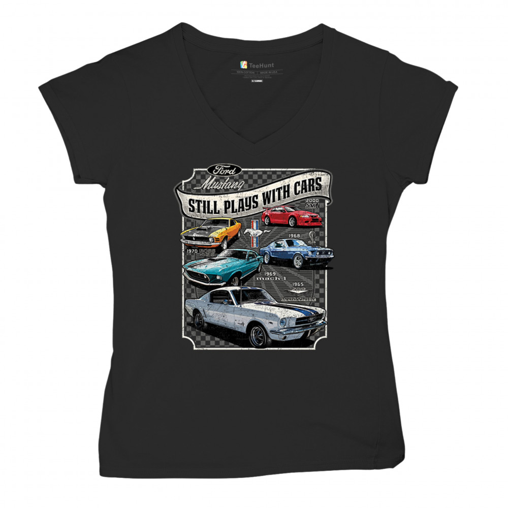This bold Ford Mustang "Still Plays With Cars" design showcases six classic models from 1965 to 2000, including the 1969 Mach 1, 1970 Boss 302, and 2000 SVT. A dream graphic for muscle car lovers, collectors, and pony car fans. Great for classic auto shows, retro cruises, garage wear, or car clubs.