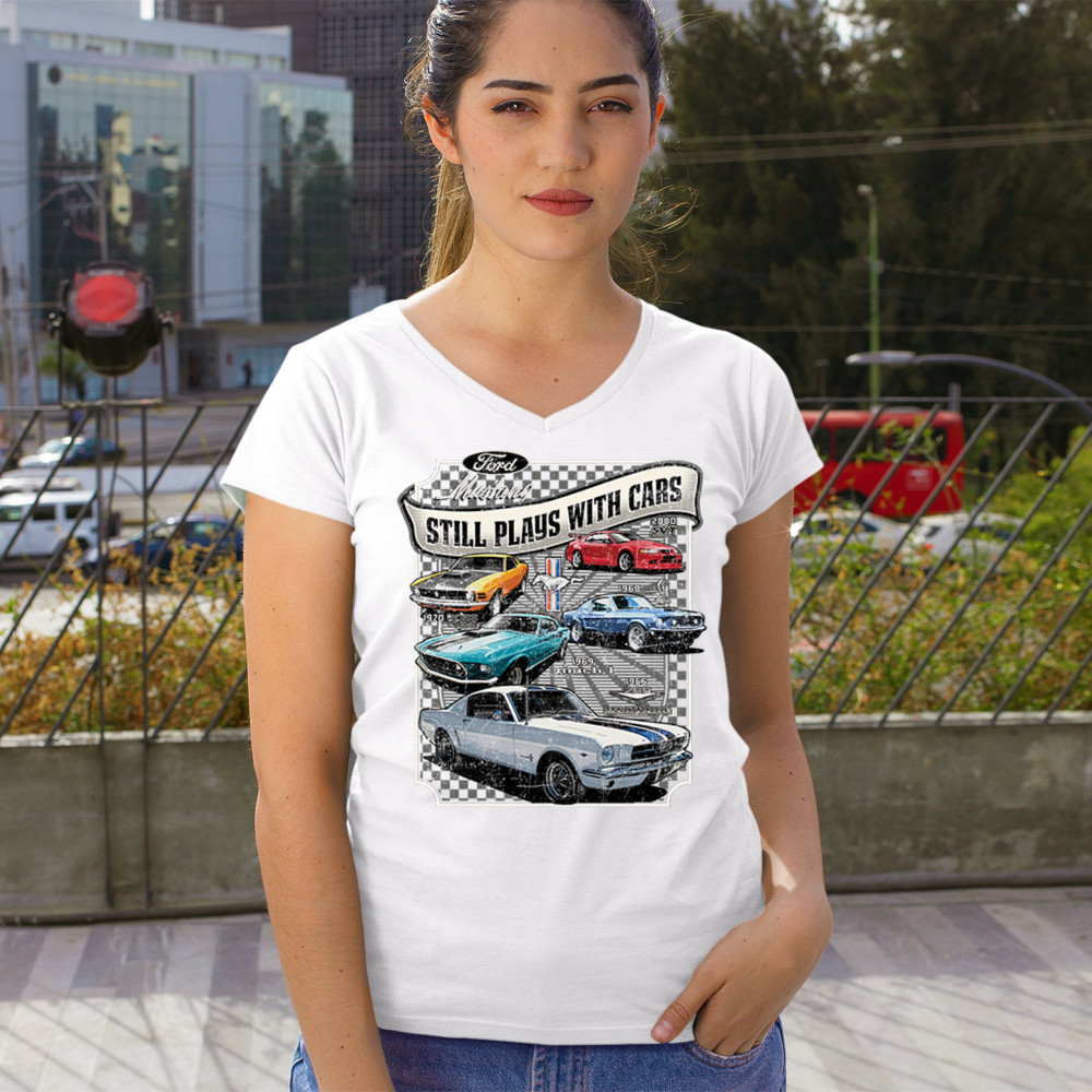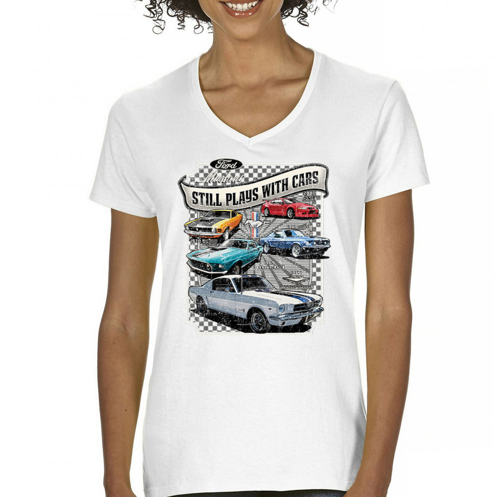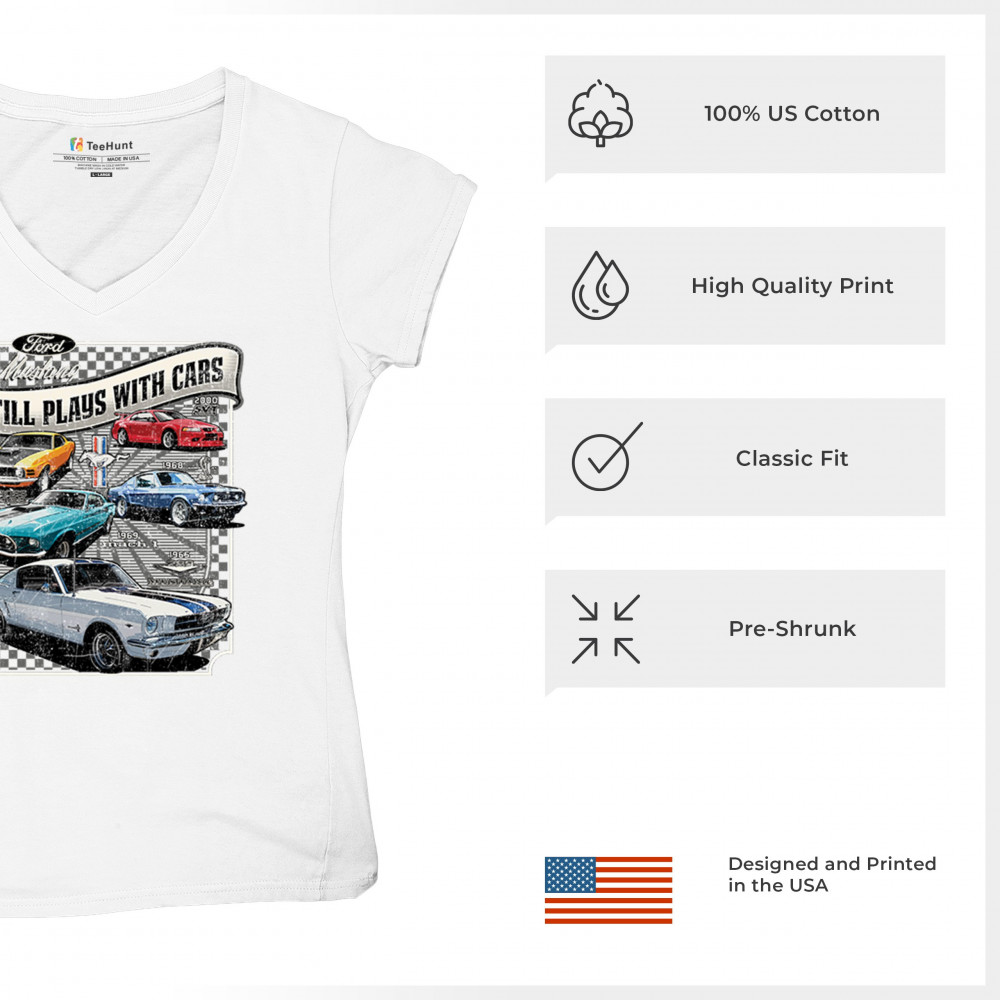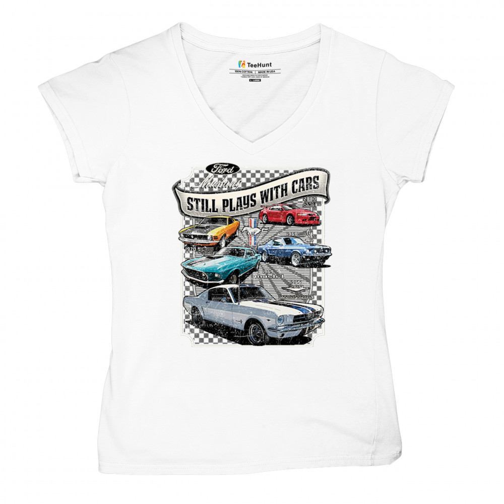 This bold Ford Mustang "Still Plays With Cars" design showcases six classic models from 1965 to 2000, including the 1969 Mach 1, 1970 Boss 302, and 2000 SVT. A dream graphic for muscle car lovers, collectors, and pony car fans. Great for classic auto shows, retro cruises, garage wear, or car clubs.