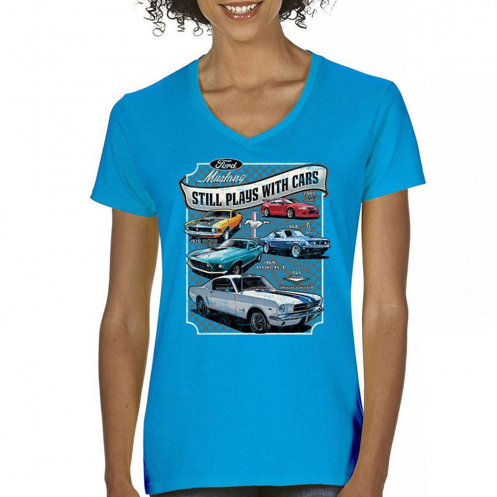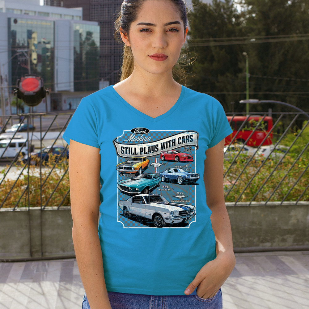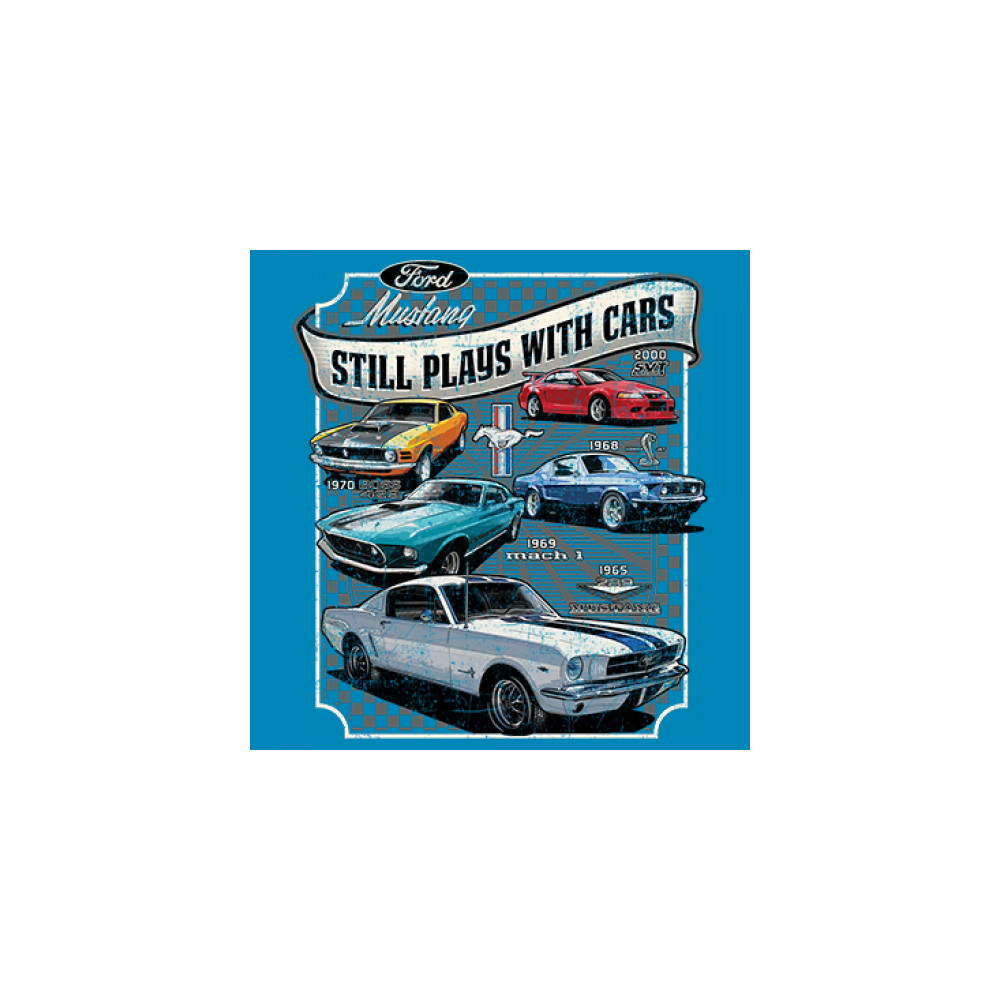 This bold Ford Mustang "Still Plays With Cars" design showcases six classic models from 1965 to 2000, including the 1969 Mach 1, 1970 Boss 302, and 2000 SVT. A dream graphic for muscle car lovers, collectors, and pony car fans. Great for classic auto shows, retro cruises, garage wear, or car clubs.