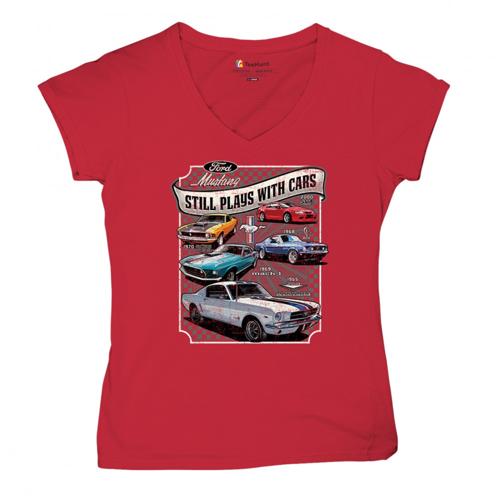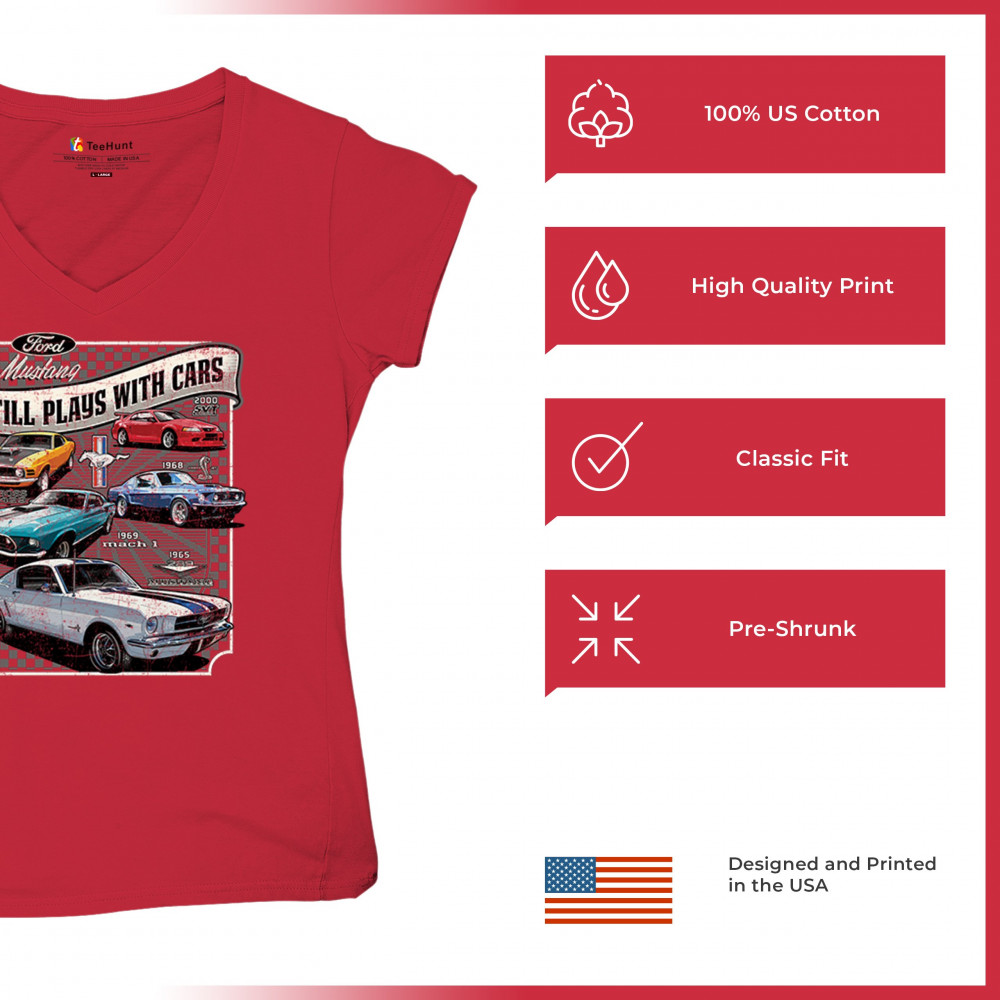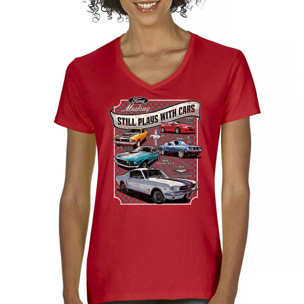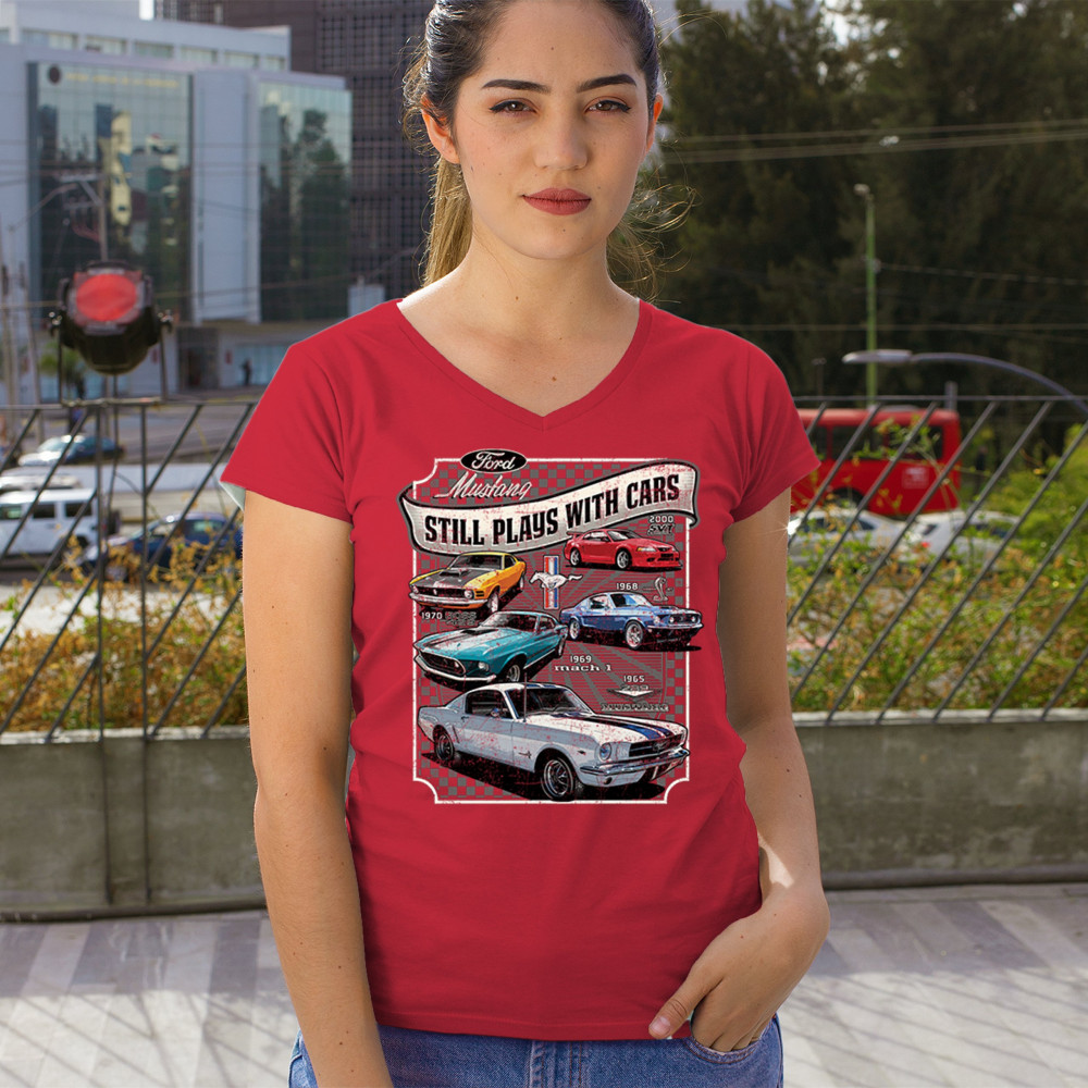 This bold Ford Mustang "Still Plays With Cars" design showcases six classic models from 1965 to 2000, including the 1969 Mach 1, 1970 Boss 302, and 2000 SVT. A dream graphic for muscle car lovers, collectors, and pony car fans. Great for classic auto shows, retro cruises, garage wear, or car clubs.