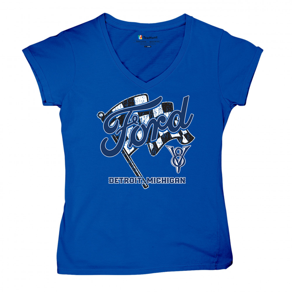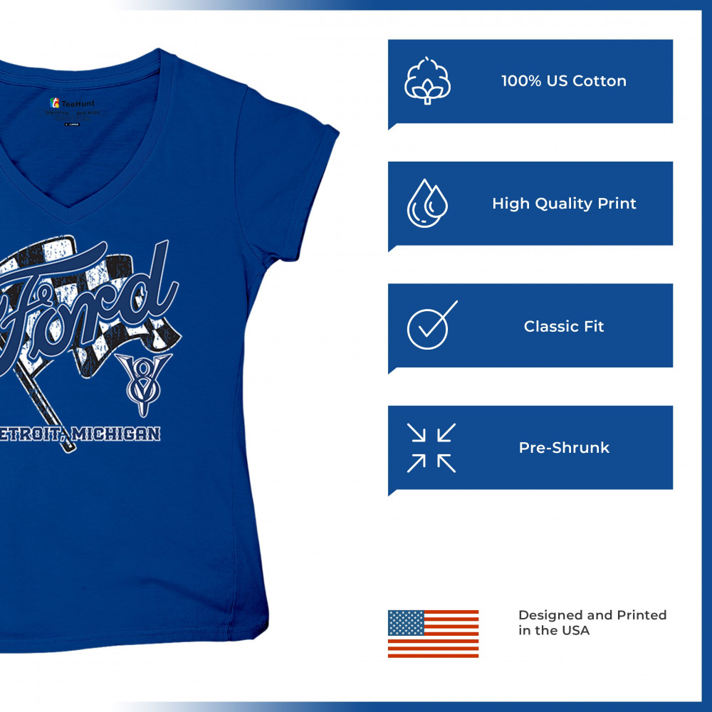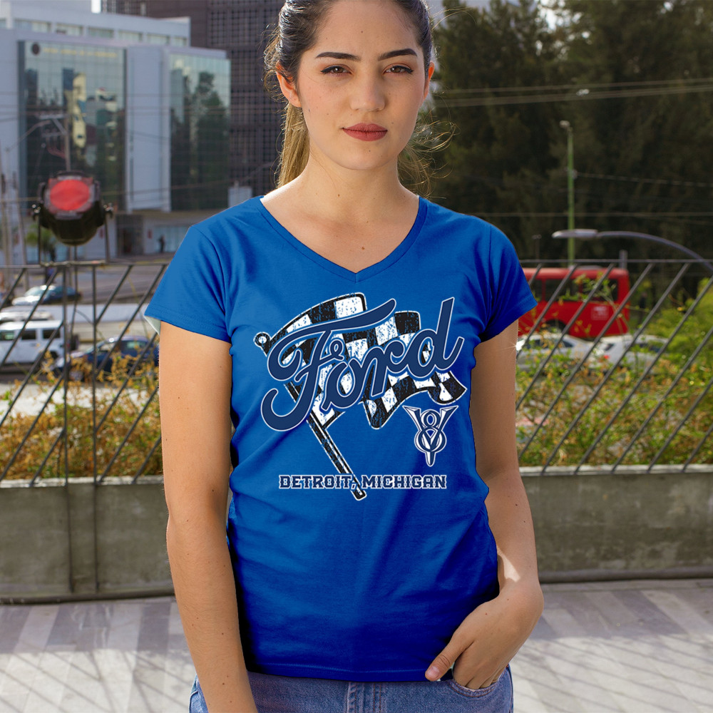 Honor Detroit, Michigan’s Ford legacy with this officially licensed design featuring a checkered flag and bold V8 emblem, perfect for muscle car fans and classic car lovers.